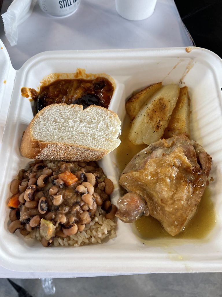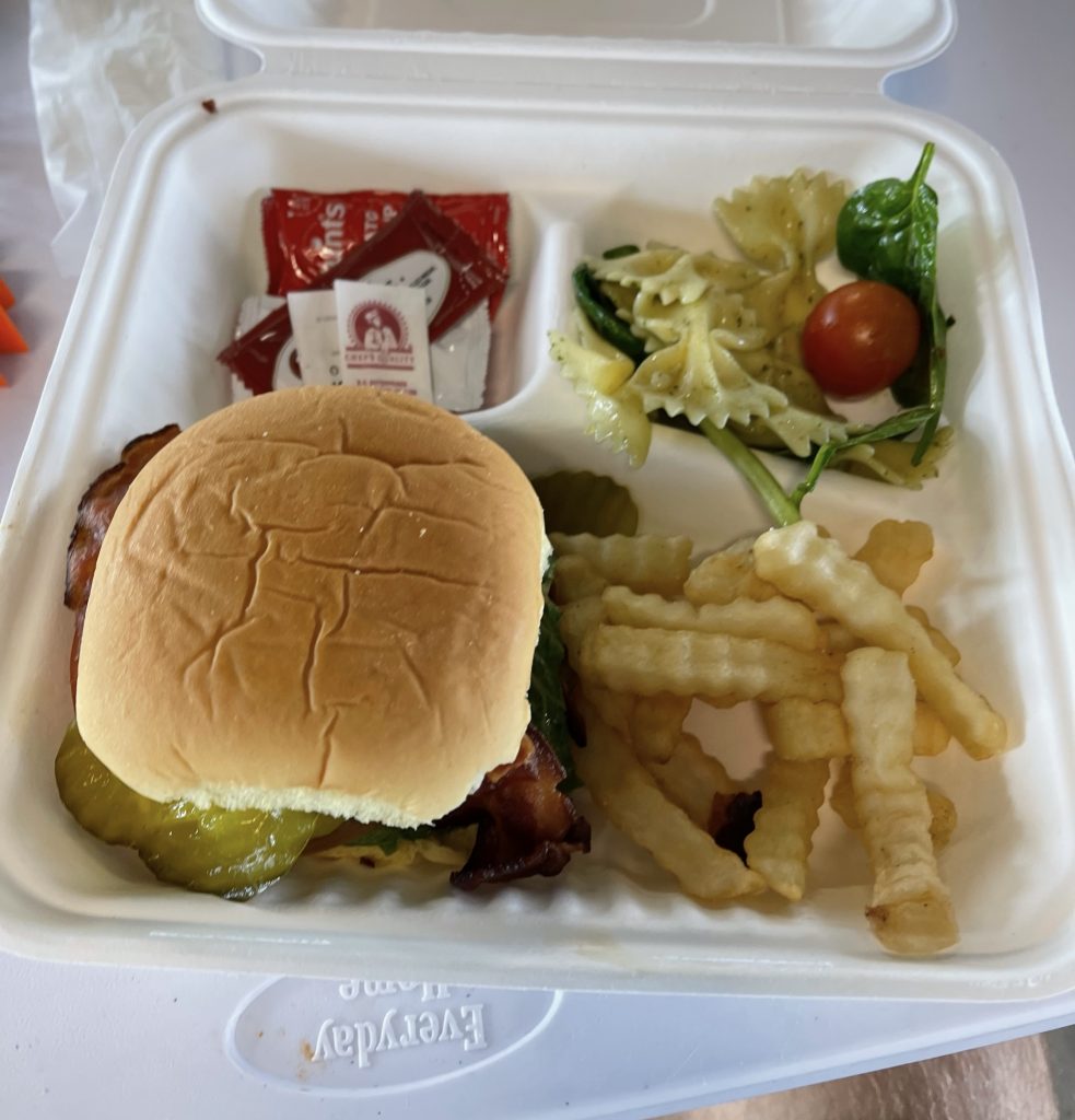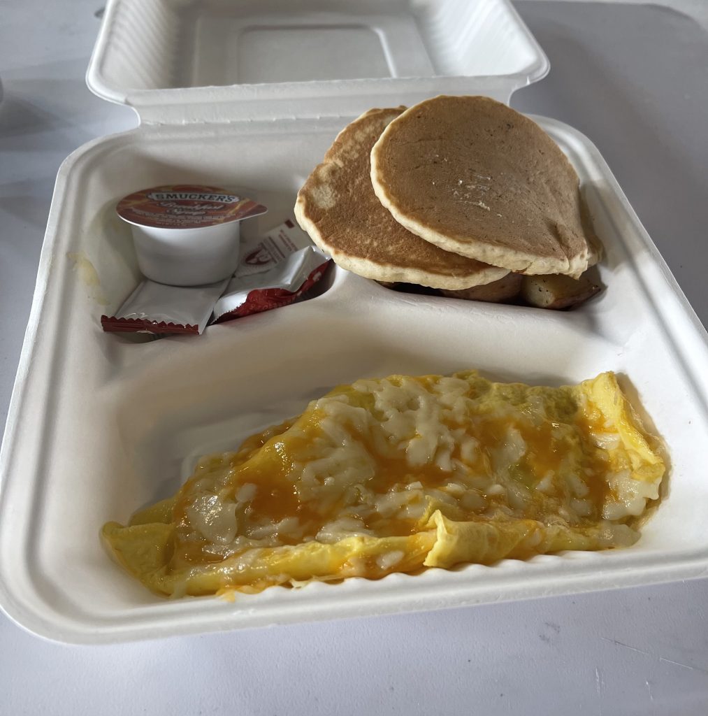В 2022 году работает система комплексных завтраков и обедов, которые выдаются в пластиковых боксах. И выбор, честно говоря, стал поменьше. Завтрак - омлет с сыром, блинчики, картошка (или гамбургер, макароны и картошка фри). Обед - курица, картошка, рис и бобы.
