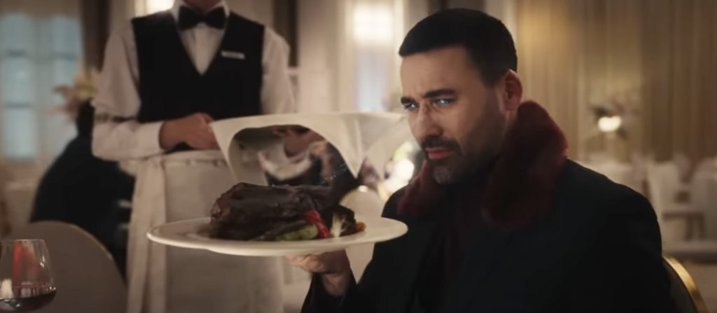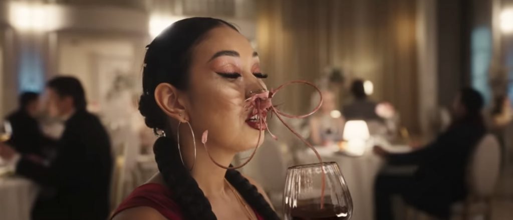 Впрочем, несколько красочных сцен тут все же найдется. Во время ужина в дорогом ресторане нам показывают, на что похожа новая элита: за аккуратными столиками сидят красиво одетые люди, у которых то мелькают жабры на открытой шее, то выдвигаются из носа щупальца, чтобы опробовать тонкие вкусовые оттенки еды - сцена, вызывающая в памяти дебютный боди-хоррор Брайана Юзны «Общество».