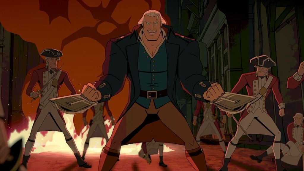 Повествование мультфильма Каллахэма берет лучшее из сюжетных троп кинокомиксов той же Marvel Universe. Зритель в некотором роде увидит, как собирается команда «супергероев» и встает на защиту идеалов Америки - еще не существующей «самой лучшей страны на свете», а лишь слова, придуманного в этой вселенной Авраамом Линкольном на смертном одре. При этом авторы уделяют внимание и развитию характеров, давая раскрыться потенциалу каждого из персонажей. Так, сам Джордж Вашингтон, периодически цитируя Евангелие от Иоанна, пытается спрятаться за харизматичными лозунгами от внутренних переживаний. Перед нами, по сути, взрослый с непроработанными комплексами: Джордж не смог создать семьи, не уберег лучшего друга от смерти, не заметил предательства, а теперь на его шее ярмо последней воли погибшего товарища. Ведомый высокими идеалами о свободе, равенстве и братстве (да, французская революция и сюда заглянула на огонек), герой трансформируется под гнетом тяжелых обстоятельств. Дабы разобраться, кто из персонажей присутствует в кадре, придется вспомнить школьный курс истории (или пойти более простым путем, открыв Википедию). «Америка: Фильм» не только использует реальных исторических личностей - в речи героев присутствует немало отсылок и параллелей с событиями войны за независимость и характерными чертами той или иной персоналии. Конечно, каждые пять минут не придется останавливать просмотр и гуглить нового героя второго плана - удовольствие от просмотра можно получить без этого. Но для более глубокого погружения в контекст и считывания межстрочных смыслов некий бэкграунд, увы, необходим. Впрочем, для тех, кто прогуливал уроки истории в средней школе, создатели работают на уровне поп-культурных заигрываний: узнать в мотивах и действиях персонажей «Звездные войны», «Форсаж», «Дюну» и другие кинокультурные феномены не составит особого труда.