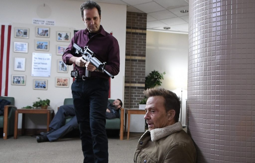 К тому же Флэнери, мягко говоря, не умеет драться - особенно это заметно в сцене с Марком Дакаскосом, который по сюжету играет снайпера за пределами госпиталя, но зачем-то покидает свою точку, прихватывает мачете (!) и проникает в заминированное здание. Кстати, с этим заминированием как-то все неясно. Несмотря на то, что сапёр захватчиков делает страшные глаза, растяжки на дверях работают только на выход, хотя по логике должно было быть наоборот. В фильме вообще много странных моментов, которые не объяснишь микроскопическим бюджетом. Одного из захватчиков Джейсон хватает за шею и у того рука с пистолетом абсолютно свободна - как вы думаете, этот «профессионал» прострелил голову Хиллу? Начальнику полицейского участка Мэлоуну (Майкл Джей Уайт - не дать актеру боевых сцен, это преступление) несколько раз прямым текстом говорят о нападении, но он все не верит и убеждает подчиненных что это звонил «тревожный» пациент. Когда Хилла захватывают, он называет себя доктором, и у него не проверяют куртку с телефоном и пистолетом (!), хотя до этого за спрятанный смартфон заложников беспощадно убивали. Как этим не воспользоваться? И Джейсон ведёт из госпиталя прямой эфир для фбр-овцев.