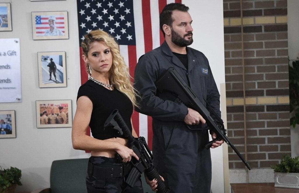 А затем нам показали русского террориста Адриана Рабикова! 30-летний Уэстон Кейдж Коппола, сын Николаса Кейджа, накрашенными глазами и хвостом волос напоминает разжиревшего Джейсона Момоа, если бы тот никогда не заходил в качалку. Уэстону самое место в каком-нибудь фэнтези или комедии вроде «Семейки Адамс». Подобной харизмой обладает и Сара Элизабет Дженсен, похожая на совенка. Водилу террристов «Зеро», которому хочется повоевать, сыграл актёр, похожий на низенького, толстенького Жан-Клода Ван Дамма. Его зовут Роберт Александр Шатковски - он американский рестлер, известный под псевдонимом Роб Ван Дам (почему у него нет боевых эпизодов?). Затем уже не удивляешься, что одна из захватчиков, Ви (Бриттани Андервуд), ходит в топике с голым животом зимой. А темнокожий генерал Уэлч напоминает пациента наркодиспансера. Сыгравший эту роль Джералд Уэбб на правах продюсера выбрал на роли жены и дочери генерала актрис арийского типа и с белоснежной кожей. Террористы вообще выглядят неубедительно - все время психуют, закатывают глаза и не особо понимают что и как делать. Наверное, здесь авторы картины решили сэкономить и на эти роли пригласили осветителей и работников кейтеринга...