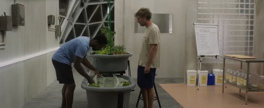 Фильм делится на две неравноценные части. Сначала следует длительная экспозиция, в которой вводятся условия обитания главных героев. Билли и Рэй играют в шахматы, регулярно бегают и смотрят любимое кино. Особенно у приятелей котируется «Смертельное оружие», где тоже на первых ролях парочка друзей с разным цветом кожи. И зритель наивно думает, что и дальше «Биосфера» будет демонстрировать однообразные будни мужчин в замкнутом пространстве. Но во второй части Эслин резко меняет тональность повествования, включая режим бога и наделяя одного из парней женскими половыми органами. Постапокалиптическая комедия превращается в неловкую драму о судьбе будущих поколений.
