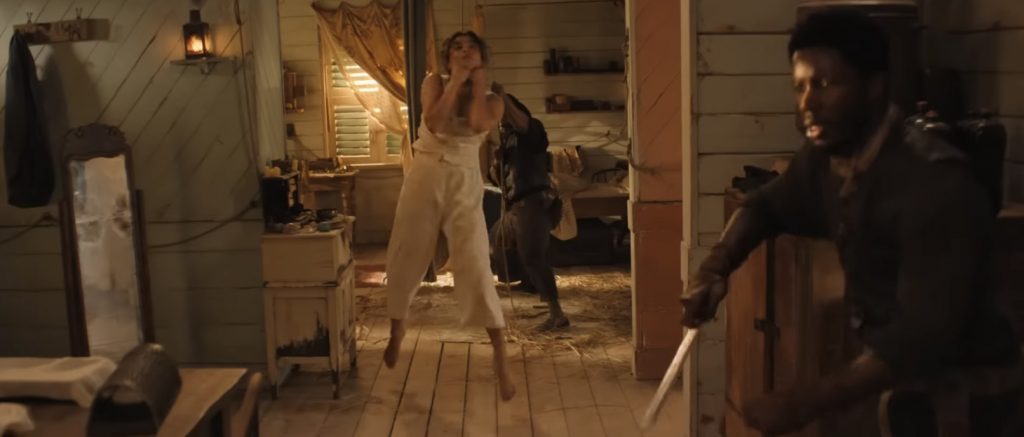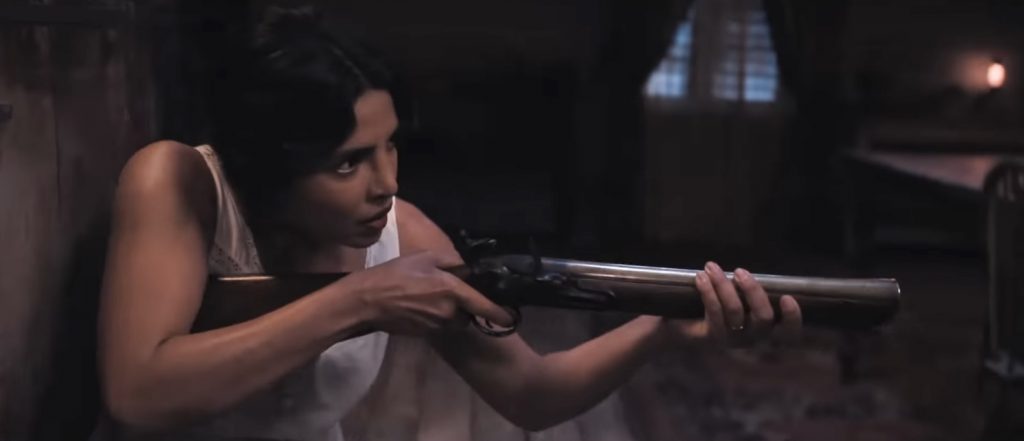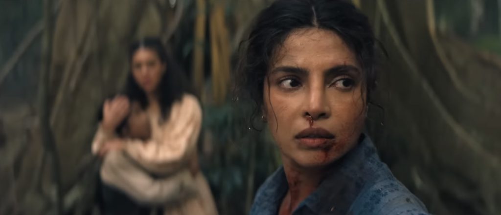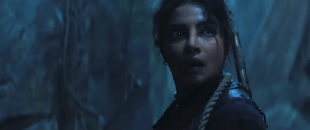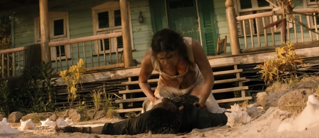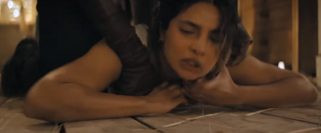 Спокойная жизнь Эрселл нарушается, когда на её дом нападают пираты, охотящиеся за её золотом. Это приводит к ожесточенной схватке, в которой она рубит их а капусту кинжалом, вырывает одному из них дреды и брызгает кровавой слюной в лицо другому. Это задает тон тщательно поставленным экшн-сценам фильма, которые не обходятся без жестокости, и Чопра Джонас полностью соответствует физическим требованиям роли. Грязные бои могут не всем понравиться, но кого-то явно возбудят моменты когда кровь попадает в объектив камеры. Если бы этот фильм не вышел сразу на Prime Video, это один из немногих фильмов, которые было бы интересно посмотреть в формате 4DX. Вторжение в дом - лишь прелюдия к тому, что нас ждёт. Остров захвачен боевиками Коннора, здоровенного громилы, склонного к зловещим философским речам, когда он смотрит на море. «Никто не покинет этот остров, пока я не заберу своё имущество», — рычит он, когда его люди штурмуют пляжи. Он говорит не о золоте, а о самой Эрселл, которую считает своей собственностью.