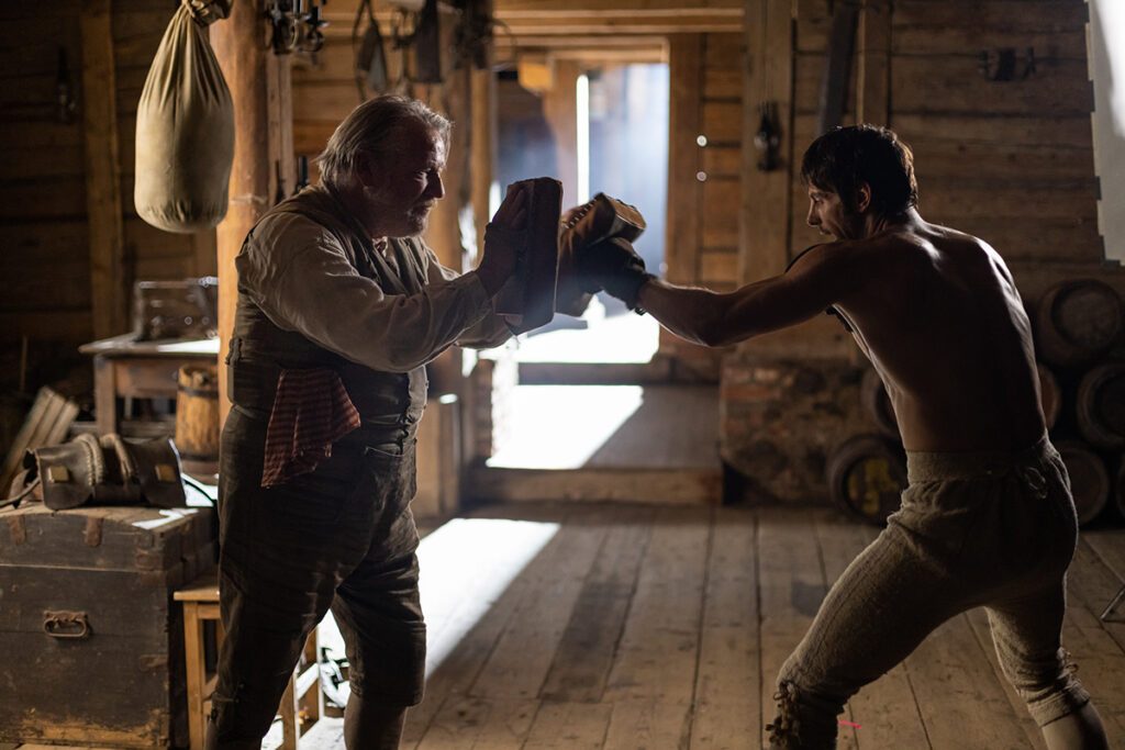 Дальше все тоже известно наперед: первая победа на ринге, упоение успехом, опасные соблазны славы (вместо наркотиков, как в боксерских фильмах про ХХ век, здесь шампанское «прямиком от Антихриста из Франции», а вот женщины - расходный материал без собственных характеров и биографий, как в любую эпоху). Появится и коварный демон-искуситель в лице лорда Рашуорта (Мартон Чокаш), заставляющего наивного Джема забыть наставления дедушки и Билла. Потом, естественно, травма, полученная не в бою, а на пьяной гулянке, раскаяние, возвращение в семью, к тренеру, в работу и тот самый кульминационный бой.