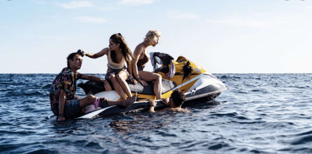 О ЧЕМ КИНО: Нэт (Холли Эрл) и ее бойфренд Том (Джек Трумен) находятся в Мексике. Весенние каникулы они проводят вместе со своими друзьями Грегом (Томас Флинн), Тайлером (Малачи Пуллар-Латчмен) и Милли (Кэтрин Ханней). После ночной пьянки компания угоняет два гидроцикла и отплывает на них подальше от берега, чтобы как следует подурачиться. Шутки заканчиваются столкновением и серьёзным ранением одного из ребят. Один гидроцикл тонет, второй не заводится, приятель истекает кровью, а к паникующим друзьям уже подкрадывается большая белая акула…