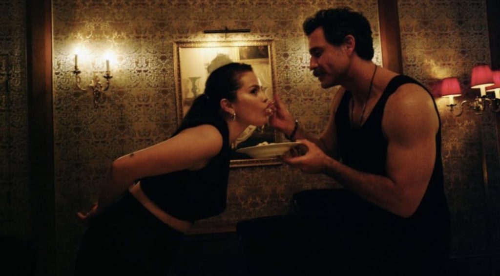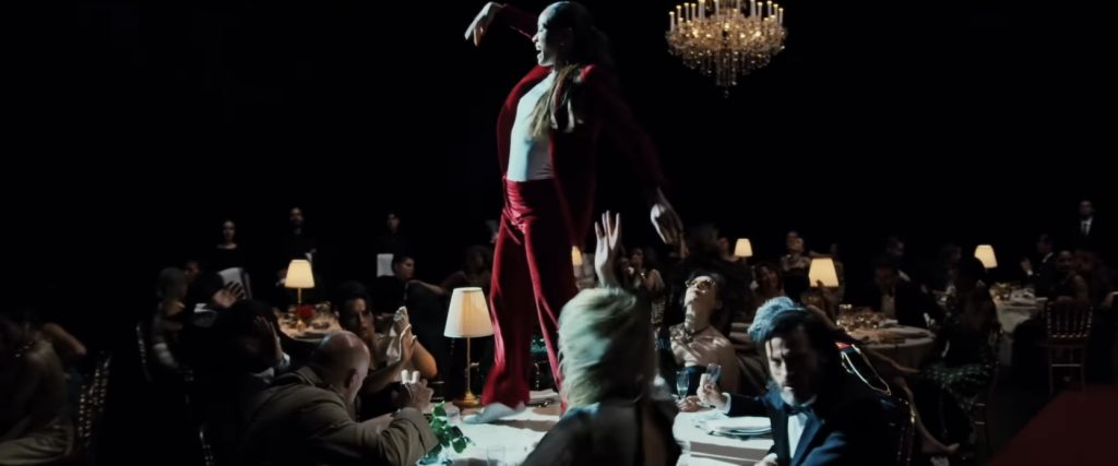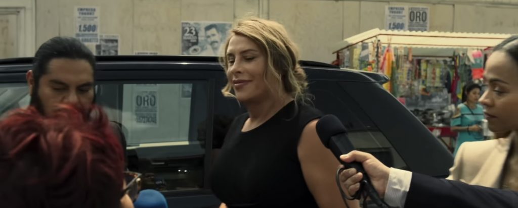 Отдельно стоит отметить, как изобретательно подошли авторы к решению проблемы с голосом гангстера. Когда он еще наркобарон, его сцены даются обычно в маленьких помещениях, где герой не столько говорит, сколько хрипло шипит, потому что голос у Карлы Гаскон довольно высокий, в этом можно убедиться в ее музыкальных номерах.