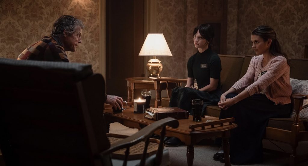 Ну и, конечно же, блестящая игра Хью Гранта - это еще один столп успеха фильма. Перед нами не просто злодей, надевший овечью шкуру лишь в первые минуты. Мистер Рид буквально жонглирует масками на протяжении всей истории, представая то радушным домоседом, то въедливым интеллектуалом и лишь в отдельные моменты превращаясь в изощренного садиста. Главным орудием Рида является отнюдь не строительный нож, а непредсказуемость в сочетании с эрудицией, так что даже сами миссионерки вынуждены признать мужчину более сведущим в вопросах религии, чем они. Необычно и место, где разворачиваются события. Дом мистера Рида поначалу кажется обычным особняком, но с легкой руки сценаристов превращается в глазах зрителя в настоящий лабиринт, и происходит это, как и развитие истории в целом, органично и плавно, не вызывая противоречий.