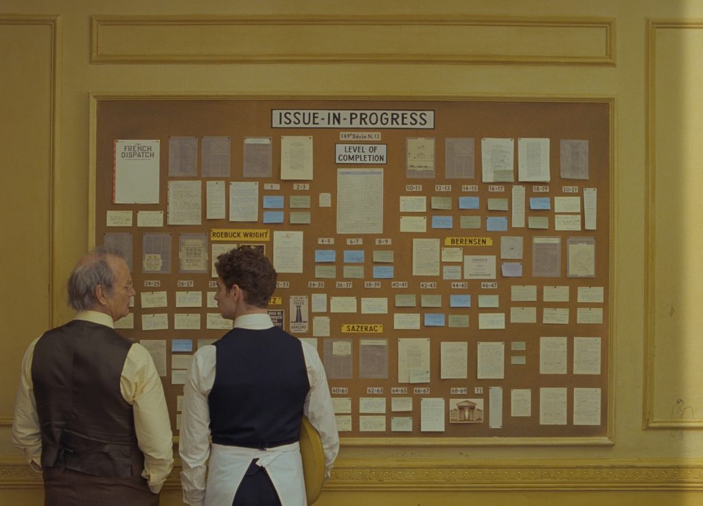 Тут зрителя поджидает первый сюрприз: это кино вовсе не о работе журналистов. Редакция «Вестника» - это типичный уэс-андерсоновский кукольный домик, но с печатными машинками. Ее сотрудники не Набоков и не Капоте, они не имеют ни примечательных черт, ни запоминающихся характеров и нужны режиссеру только как рамка, внешнее обрамление острых сюжетов-новелл. Это скорее оммаж знаменитым обложкам «Нью-Йоркера», чем, собственно, его статьям.