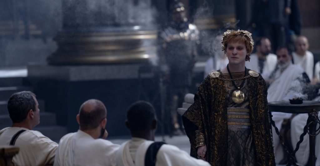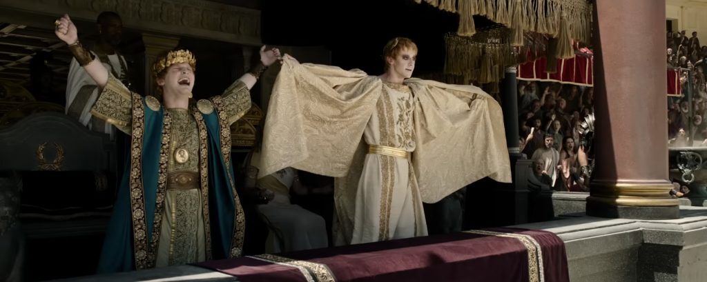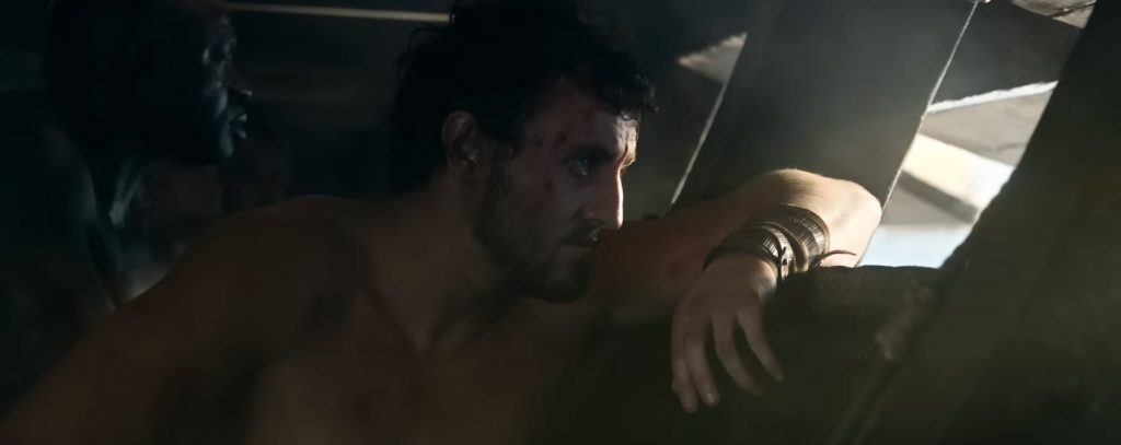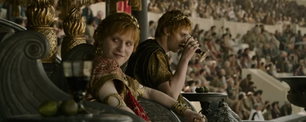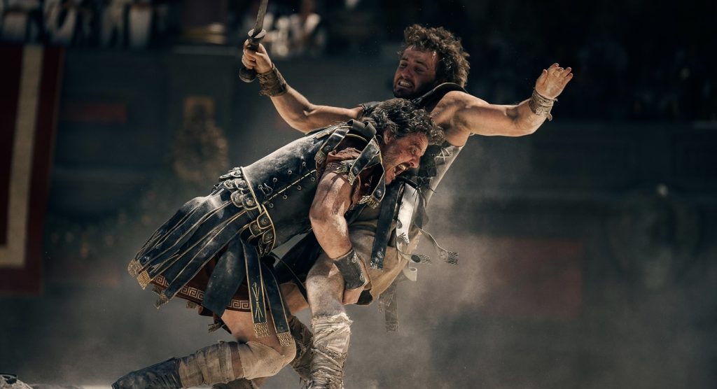 Луций захвачен, продан в рабство и... да... становится гладиатором, как и его отец, хотя и впечатляет своей способностью цитировать Вергилия. Так же, как и Максимус, он противостоит шепелявому, презрительному, немужественному императору, вроде Коммода из фильма 2000 года. Но на этот раз разделенному на двоих: соправителей Гета (Джозеф Куинн) и Каракалла (Фред Хекинджер) - оба щеголяют подведенными глазками почти как у панды.