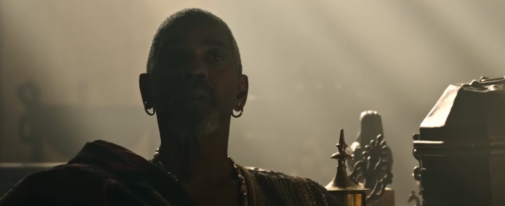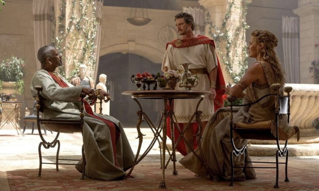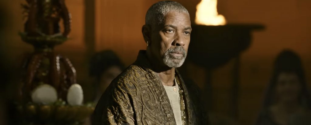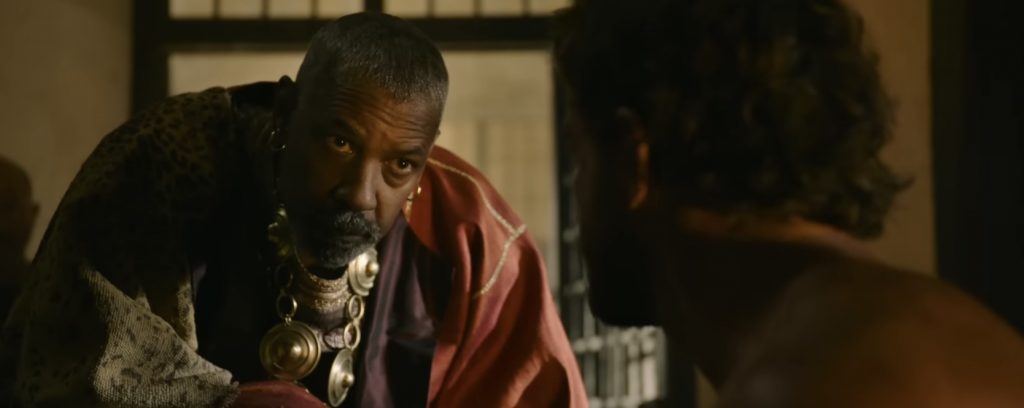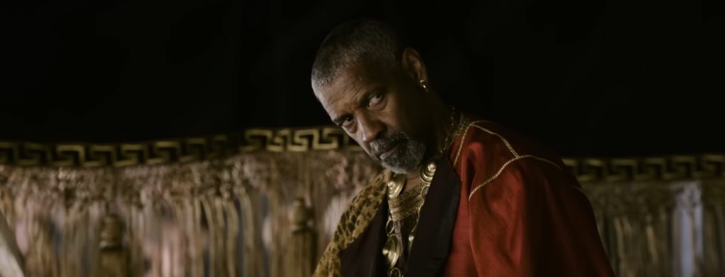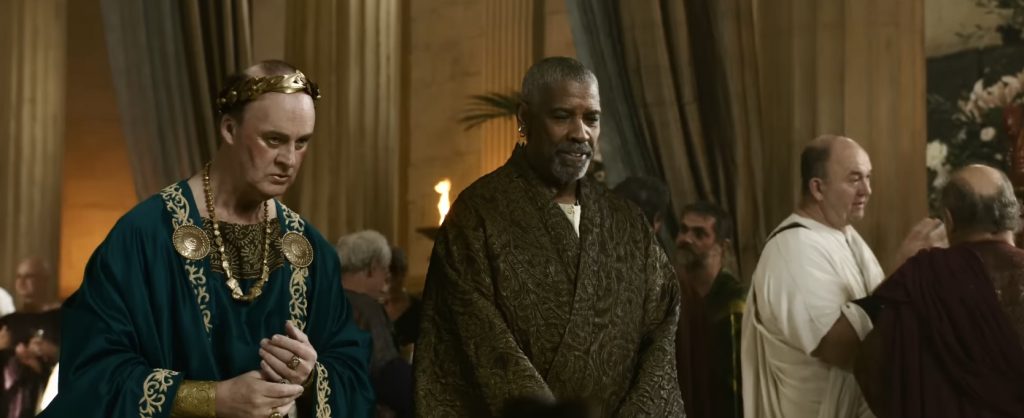 Дензел Вашингтон наследует роль Оливера Рида; он играет хитрого владельца гладиаторской школы, который планирует превратить благоволение недалеких правителей в политическую власть. На самом деле Вашингтон почти крадет всю картину, когда его персонаж Макрин ловко эксплуатирует одержимость гладиаторскими боями слабого и двуличного сенатора Фракса (Тим Макиннерни). Именно Дензел Вашингтон получает фразу, которая может стать мемом в социальных сетях, когда он шипит прямо в лицо Фракса: «Это, мой друг, политика-а ...»