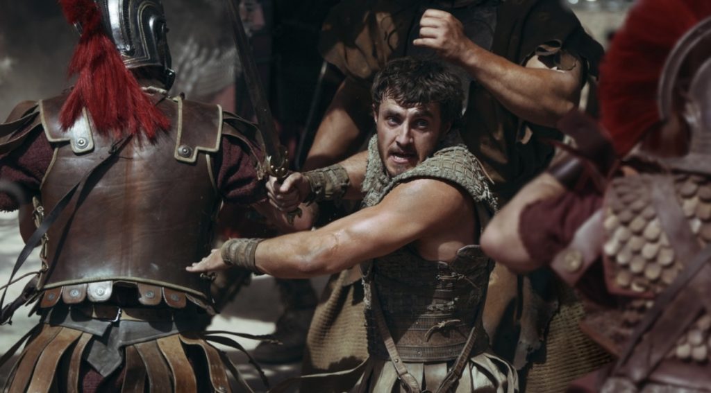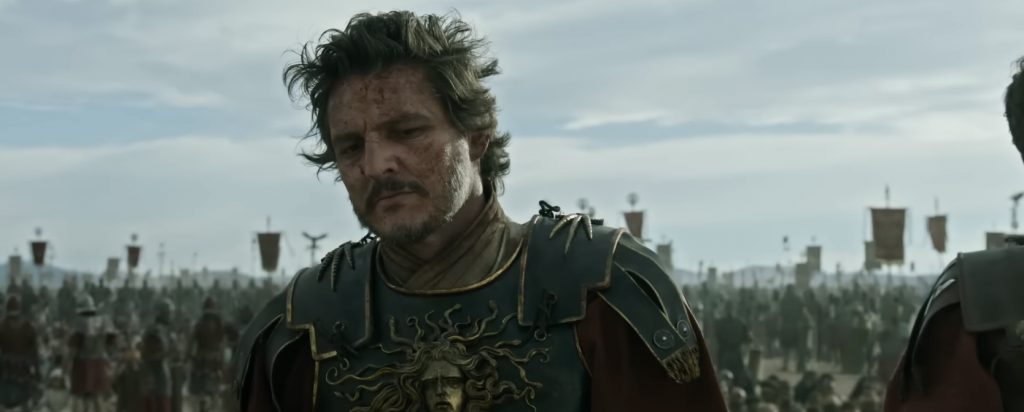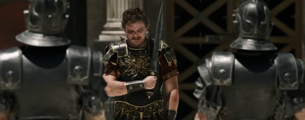 ВПЕЧАТЛЕНИЯ И АКТЕРЫ: в свои 28 лет Пол Мескал моложе Рассела Кроу, которому было 36, когда он взял на себя роль Максимуса в первой части. Мескал играет Луция, сына Максимуса. Он повзрослел на сепаратистской территории Нумидии, где его, 12-летнего, спрятала мама Луцилла (Конни Нильсен). Теперь Луций - солдат, а его жена Аришат (Юваль Гонен) тоже воин. Об их ребенке не упоминается, но есть предчувствие, что в будущем мы узнаем о сыне (не дочке же!), спрятанном от опасностей битвы. Жесткий, честный генерал римлян Марк Акакий (Педро Паскаль) исполняет свой долг, но уважает воинскую храбрость противников и не имеет ничего общего с мерзкими римскими политиками. По сути, он не только является новой версией Максимуса, который сражался с тевтонами, но и женат на Луцилле! (интересно, что в фильме «Чудо-женщина 1984» Паскаль сыграл роль практически Дональда Трампа).