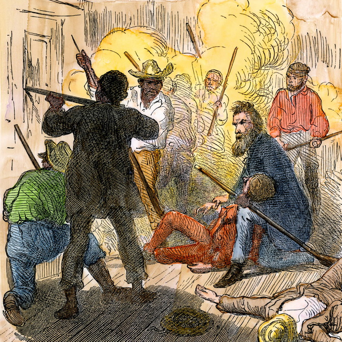Белокожий Джон Браун (1800 - 1859) выступал за использование вооруженного восстания для свержения института рабства в Соединенных Штатах . Впервые он привлек внимание страны, когда возглавил небольшие группы добровольцев во время Канзасского кризиса 1856 года. Он был недоволен пацифизмом организованного аболиционистского движения: «Все эти люди болтают. Что нам нужно, так это действие!» В мае 1856 года Браун и его сторонники убили пятерых сторонников рабства в резне в Поттаватоми. В октябре 1859 года Браун возглавил рейд на федеральный арсенал в Харперс-Ферри, штат Вирджиния, намереваясь начать движение за освобождение рабов, которое распространится на юг через горные районы Вирджинии и Северной Каролины. Он захватил оружейный склад, но семь человек были убиты, десять и более ранены. Браун намеревался вооружить рабов оружием из оружейной, но лишь небольшое количество местных рабов присоединилось к его восстанию. В течение 36 часов те из людей Брауна, которые не сбежали, были убиты или захвачены местными фермерами, ополченцами и морскими пехотинцами США. Брауна в спешке судили за измену Содружеству Вирджиния, убийство пяти человек и подстрекательство к восстанию рабов; он был признан виновным по всем пунктам обвинения и был повешен. Браун был первым человеком, казненным за государственную измену в истории Соединенных Штатов.
