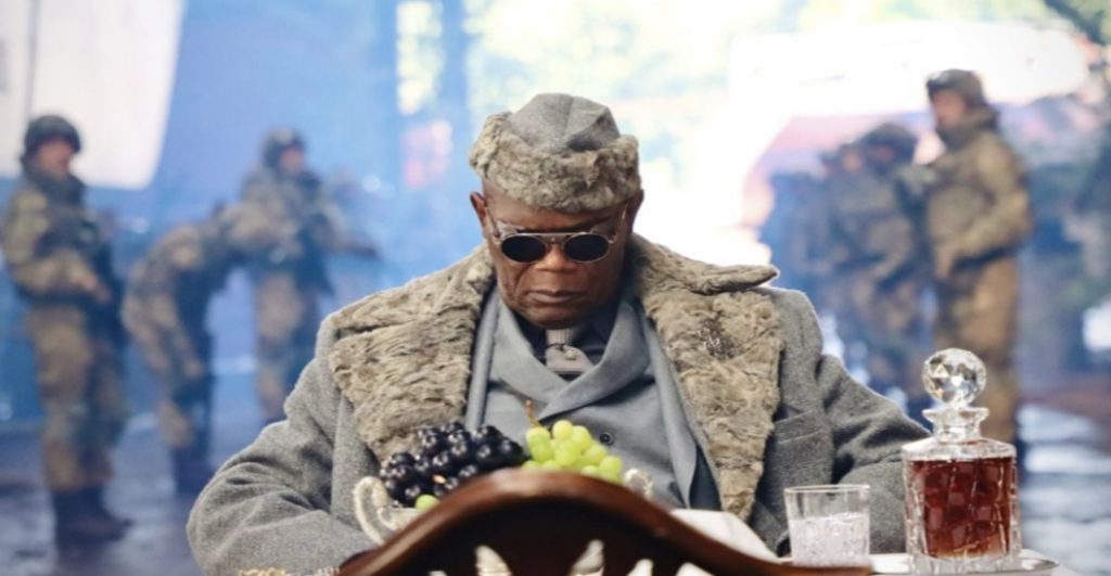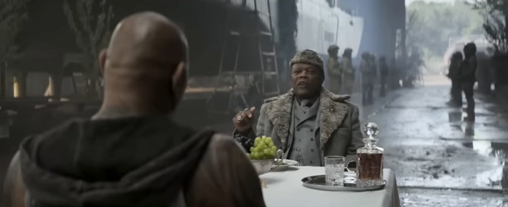 Дэйв Батиста в образе железного Арни и Сэмюэл Л. Джексон в роли короля Великобритании…