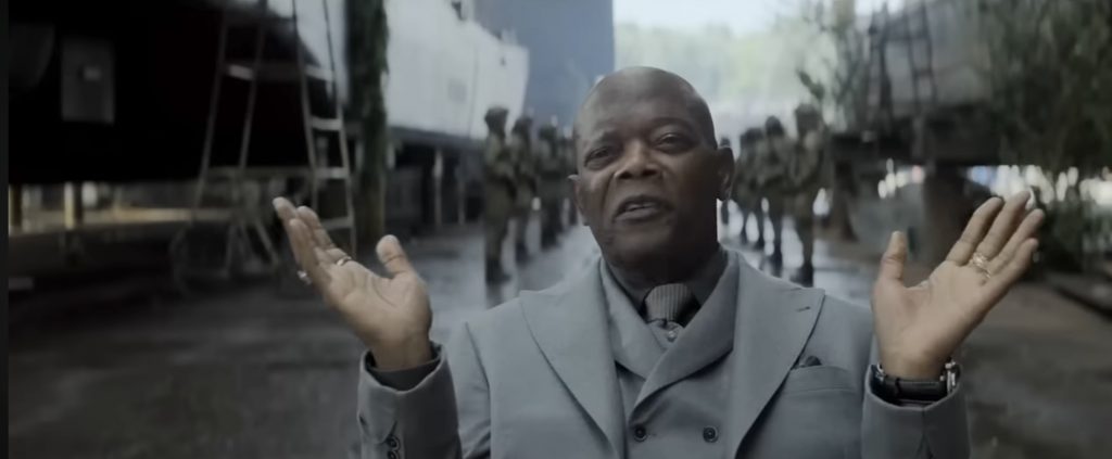 Дэйв Батиста в образе железного Арни и Сэмюэл Л. Джексон в роли короля Великобритании…