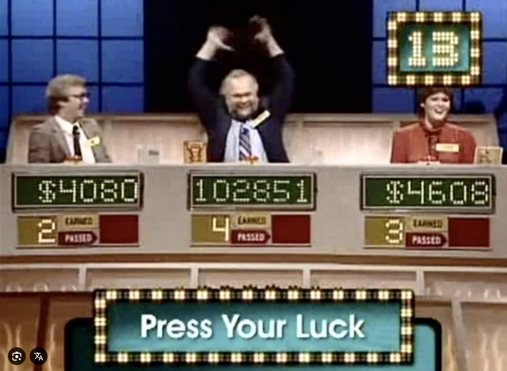 Press Your Luck - это получасовое телевизионное игровое шоу телеканала CBS. Шоу начиналась с раунда вопросов с несколькими вариантами ответов, где участники зарабатывали три вращения Big Board (Большой доски) за каждый правильный ответ. Big Board представляла собой кольцо из 18 светящихся квадратов, которые быстро загорались в, казалось бы, случайной последовательности, пока участник не нажимал кнопку, чтобы ее остановить. На самом деле, последовательность была ограничена всего пятью различными вариантами (по причине ограниченного бюджета пилотного эпизода). Каждый выбранный квадрат кроме денег предлагал еще три варианта - поездку на фешенебельный курорт, снова деньги и дополнительные вращения на доске; каждое вращение имело один шанс из шести попасть на «Сглаз» Whammy, анимированного персонажа, который уничтожал накопленные выигрыши этого участника. За первые несколько эпизодов шоу победители в среднем получали около 14 000 долларов США (что эквивалентно примерно 44 000 долларов США в 2024 году). Шоу проходило с сентября 1983 года по сентябрь 1986 года, а ведущим был Питер Томаркен.