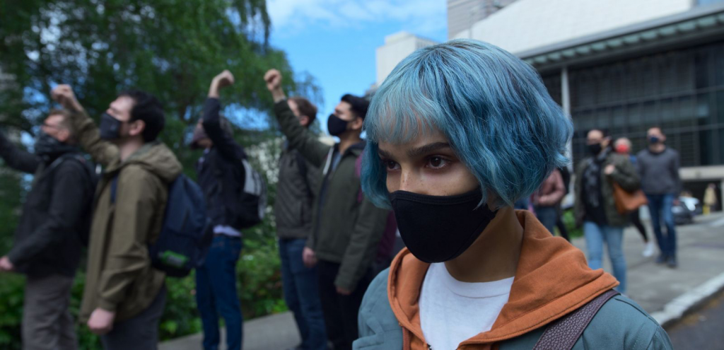 «Кими» - умелый портрет эпохи коронавируса, который в один момент и вовсе начинает спекулировать на теориях заговора. Если открывается фильм как хичкоковское «Окно во двор», то ближе к финалу он обрастает целым комплексом современных фобий: прослушивание личных устройств, слежка спецслужб и сокрытие насилия на сексуальной почве - Анджела, которая впервые за долгое время выходит в открытый мир, заражается массовой паникой (как покажет опыт, не беспричинно). Ковид здесь служит лишь одним из множества сюжетных обстоятельств, и всё-таки именно через призму эпидемии «Кими» раскрывается с новой стороны: это очень циничное кино о том, как после одной трагедии может исчезнуть доверие и к обществу, и к тем, кто его регулирует.