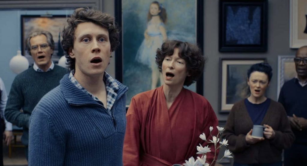 ВПЕЧАТЛЕНИЯ И АКТЕРЫ: в «Акте убийства» Джошуа Оппенхаймер предлагал индонезийским киллерам, устроившим геноцид коммунистов в 1960-х, повторно разыграть сцены их самых любимых смертей. Во «Взгляде тишины» брат одного из погибших напрямую обращался к палачам их памяти. В «Конце света» Оппенхаймер соединяет театрализованность с невозможностью прощения и осознанием своего пособничества во вселенской трагедии. От выжигающей изнутри безысходности герои начинают петь в самых разных тональностях и тембрах, необязательно ровно, при этом всегда переходя в стадию определённого экстаза. Музыка Джошуа Шмидта и Мариуса де Фриза («Мулен Руж») на слова самого Оппенхаймера не создана для всеобщего обожания и добавления в подборки на стриминговых платформах. Песни скорее монологичны, стилистически напоминают творчество легендарного бродвейского композитора Стивена Сондхайма («Чем дальше в лес»), намеренно выводят из себя. Героиня Суинтон фальцетом пытается улететь из условной «золотой клетки», которую возвела себе самостоятельно. Отец медленно приходит в ужас от того урона, который нанесла его энергетическая деятельность планете. Невинность Сына оборачивается повторением паттернов своих родителей. Девушка начинает испытывать муки совести за «убитую» ею семью (и не одну).