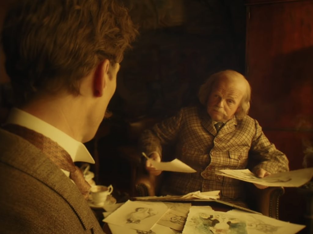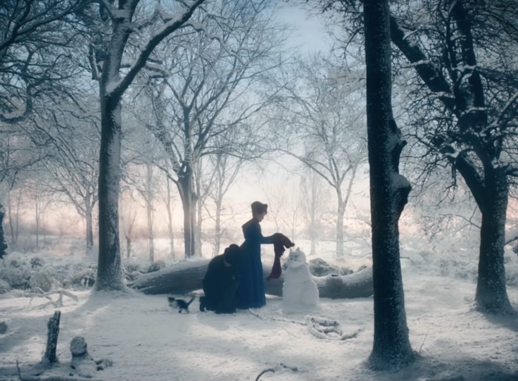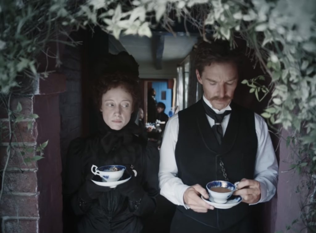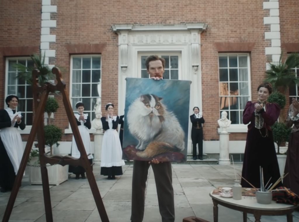 Оттого удивительно, как невероятно пестр визуал «Кошачьих миров»: Эмили с ее рыжей гривой волос предпочитает яркие платья с изящными узорами, вместе с Луисом они переезжают в маленький домик, утопающий в зелени полей, и обклеивают его броскими обоями. Они и выстроенная ими жизнь очень отличаются от серого, строгого и педантичного викторианского Лондона, и тем не менее совершенно очевидно, что их отъезд - это лишь временный побег, кратковременная передышка. Об этом напоминают какие-то мелкие детали, вроде древних дубов, рассказ о которых Эмили закончит фразой об их 300-летнем умирании. И очень любопытно, что Уэйн даже в самые мрачные периоды своей жизни продолжает рисовать невероятно красочных, почти психоделических кошек, особенно ближе к старости, словно держа в памяти тот короткий отрезок времени, что он провел в своем личном раю.