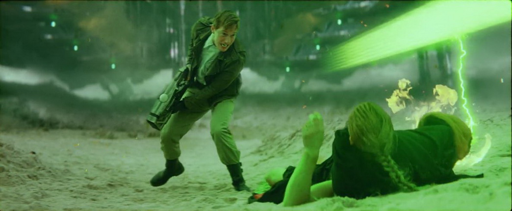 Словом, Эрнандес и Жоли-Гонфар, отказавшись от чрезмерного поклонения кумирам (вроде тех же Вачовски), вошли во вкус радостной свободы творчества. Расхожие фантастические мотивы могли бы быть привнесены и формально, если учесть, что основное внимание всё равно уделено визуальному ряду, воздействующему ещё сильнее в сочетании с музыкой Франка Уэзо. Личное оружие, стреляющее смертоносными зелёными лучами огромной мощности, трансформирующийся космический корабль, вращающийся «череп» Трейси – придумана масса остроумных деталей! Вместе с тем, вопреки аляповатому антуражу и слегка неадекватному поведению действующих лиц (от профессиональных актёров, к слову, потребовался особый навык подобного, с элементами гротеска существования на экране), затронутые темы на поверку – звучат не так глупо, как ожидалось. Васкану, демонстрирующему замашки самоуверенного мачо и не скрывающему расистско-сексистского отношения к тем, кто слабее, не дано понять, что в жилах машин течёт самая настоящая кровь. Якобы бездушные «железяки» стали подлинно живыми, как только обрели разум и получили представления о морали. Отныне они имеют право защищаться от попыток своей утилизации (умерщвления!) – и даже делают смелую заявку на создание собственной цивилизации, собственной культуры, собственного мира. Ещё чуть-чуть – и высокий пафос обретёт религиозный накал…(Евгений Нефедов)