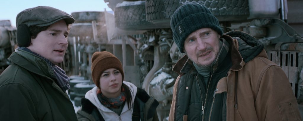 «Ледяной драйв» - достаточно любопытный зверь, причем по множеству причин. Это и сценарист/режиссёр Джонатан Хенсли, которы решил скрестить «Плату за Страх» с фильмом «О мышах и людях» (!). И бывший оператор Клинта Иствуда Том Стерн, чья камера пару раз навевает воспоминания о первых «Голодных играх». И монтажер «Бёрдмена» Дуглас Крайс, который обрезает удар Нисона по вражескому лицу за 10 кадров до предположительного попадания в цель. Причин действительно много. Но главная всё же в постановщике, который снимает своё кино с невероятной страстью. Из шедевра Анри-Жоржа Клузо здесь сюжет о грузовиках, перевозящих очень важный багаж по очень плохой дороге из пункта А в пункт Б (правда, вместо нитроглицерина в кузовах спасательное оборудование, но сама трасса и один очень мутный попутчик представляют опасность и без взрывчатых веществ). Из романа Стейнбека, точнее его экранизации, снятой Льюисом Майлстоуном в 1939 году (саму книгу режиссер Джонатан Хенсли, судя по его комментариям, не читал),- парочка персонажей: дальнобойщик-фрилансер Майк (Лиам Нисон) и его брат-инвалид Гурти (Маркус Томас). Опять же выведенных с некоторыми отличиями от источника вдохновения: вместо умственной отсталости у Гурти афазия - нарушение речи из-за ранения, полученного в Ираке. Из-за этого ему сложно задержаться на одной работе, хотя он талантливый механик, и они с братом и ручной крысой колесят по всему североамериканскому континенту, перебиваясь временными подработками. Случайно увиденное объявление приводит их на север Канады, где из-за аварии на алмазной шахте под завалами оказались два с лишним десятка работяг. Почему-то на самой шахте нет необходимой для их спасения бурильной установки, и страховая компания ищет отчаянных (и отчаянно нуждающихся в деньгах) водителей, способных в кратчайший срок пробраться по ледяной дороге через замерзшее озеро. Меж тем на дворе стоит ласковый манитобский апрель, когда температура за бортом всего каких-то минус тридцать, и лед вот-вот начнет таять. Поэтому у шоферов сразу два дедлайна: успеть надо до того, как у шахтеров закончится кислород, а также до того, как трасса перестанет выдерживать тридцатитонные фуры. Помимо Майка и Гурти, которых привлекает назначенная страховщиками высокая премия, в путь отправляются сам начальник транспортной компании афроканадец по фамилии Голденрод (Лоренс Фишбёрн) и одна из его лучших водил, представительница коренного народа Танту (Эмбер Мидфандер). У нее в этом деле есть, помимо денежной, сентиментальная заинтересованность: среди пострадавших шахтеров ее сводный брат (Мартин Сенсмейер),— а вообще эта героиня, видимо, должна привнести дух современности в историю, в остальном буквально пропитанную олдскульной маскулинностью. Именно ей приходится взять на борт бесполезного на первый взгляд пассажира - статистика из страховой компании (Бенджамин Уокер), который сразу же вызывает подозрения, например тем, что он единственный в такую погоду носит шапочку с ушками. Разумеется, путь до злосчастной шахты простым не будет: катастрофы начнут происходить почти сразу же. Но, надо признать, огромные грузовики на льду выглядят весьма эффектно (так, что местами фильм начинает напоминать очень длинный рекламный ролик), по крайней мере поначалу. Однако картина теряет ритм каждый раз, когда режи