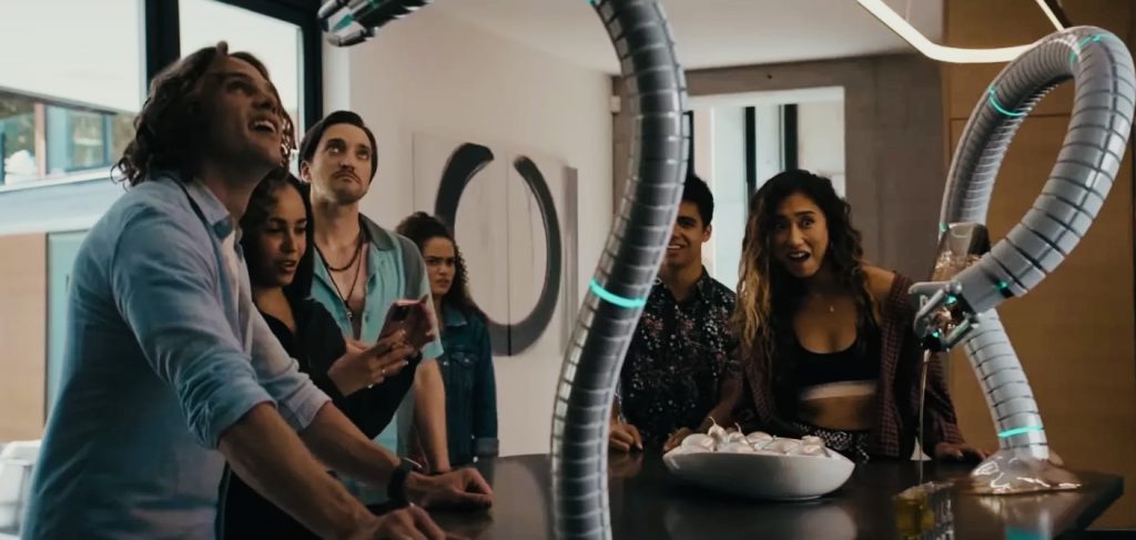 Для начала «Марго» показывает свои возможности. Она способна на волшебство, работая со всеми видами техники и роботизированными руками, и гарантирует, что гостям будет предложено все, что они пожелают. Хотя компьютерная графика оставляет желать лучшего, авторы фильма проявляют неуемную фантазию. Например, специальная жидкость, которая действует как «кровь» дома, способна печатать на 3D-принтере все что угодно - хоть предметы комфорта, хоть двойников Клэя и Девон, чтобы оживить вечеринку. «Марго» использует сленг поколения Z и оперативно делает обновления в социальных сетях. А Клэй получает в подарок собственную теплицу с марихуаной премиум-класса. Все это кажется идеальным отдыхом, но «Марго» не заинтересована в пятизвездочных обзорах.