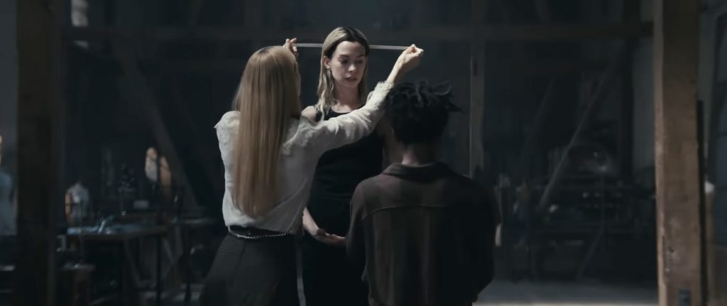 А затем появляются призраки…Не раскрывая всех подробностей - долгая ночь, которую они проводят вместе, приобретает галлюцинаторный характер: сначала Сэм рассказывает о видении, которое явилось ей и манило следовать за ней, а затем Мэри признается, что это же видение вселилось в ее тело и может быть выпущено только через портал во время тура. Или что-то в этом роде. Режиссер воплощает это видение в виде закручивающегося клубка красной ткани, обретающего почти телесную форму, завораживающий всплеск цвета в роскошной темноте визуальных образов оператора Эндрю Дроз Палермо. Но что это означает помимо очевидных коннотаций мучительной кровной связи, охватывающей творческое сотрудничество, а также личную, возможно, даже романтическую связь, - остается загадкой. Это не становится яснее даже после того, как некие оккультные действия в меловом круге переносят их обратно в ночь, когда Мэри и группа молодых женщин участвовали в сеансе, во время которого Имоджен (FKA twigs) физически вызывала духа.