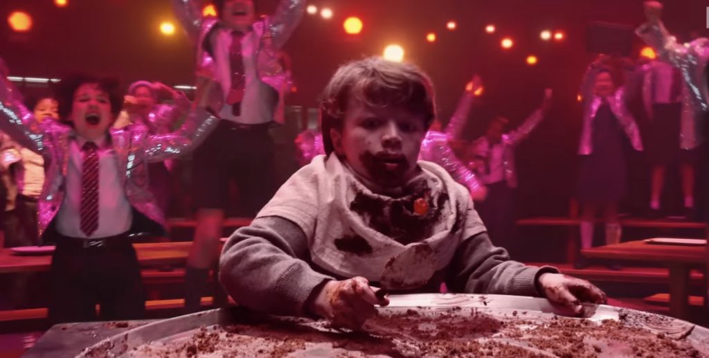 В этой сказке, несмотря на мультяшное сумасшествие сюжета, которое фильм обыгрывает своими цветовыми схемами, эстетикой балаганного кукокольного театра и жестким, плоским освещением, есть и реалистичные тяжелые эпизоды. Вероятно, самый ужасный момент наступает, когда мальчик по имени Брюс Богтроттер (Чарли Ходсон-Прайор) крадет кусочек шоколадного торта мисс Транчбулл, и она наказывает его, заставляя съесть его целиком на глазах у всех. Такое вполне могло произойти в реальной жизни.