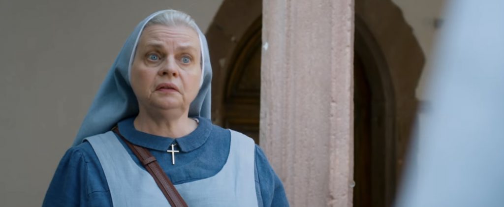 ВПЕЧАТЛЕНИЯ И АКТЕРЫ: фильм Фредерика Кирина можно разделить на три части. Первая часть, как и вторая, очень динамична, поскольку монашка Люси оказывается предоставленной самой себе в современном мире. Юмор строится на её дезориентации по отношению к современным реалиям: технологиям, одежде и даже знаковым событиям последних двух десятилетий, которые она с изумлением открывает для себя. Особо выделяются две повторяющиеся хохмы: одна связана с мобильным телефоном и его голосовым помощником, который сестра Люси воспринимает как божественный голос. Другая - с автоматическими дверями. Остальные комедийные моменты также удачны, особенно когда ей приходится переодеться и она оказывается похожей на Джулию Робертс из «Красотки», как и помогающие ей проститутки. Марилу Берри, конечно, напоминает Жозиан Беласко, но явно ей проигрывает, когда нужно выглядеть по-настоящему придурковатой.