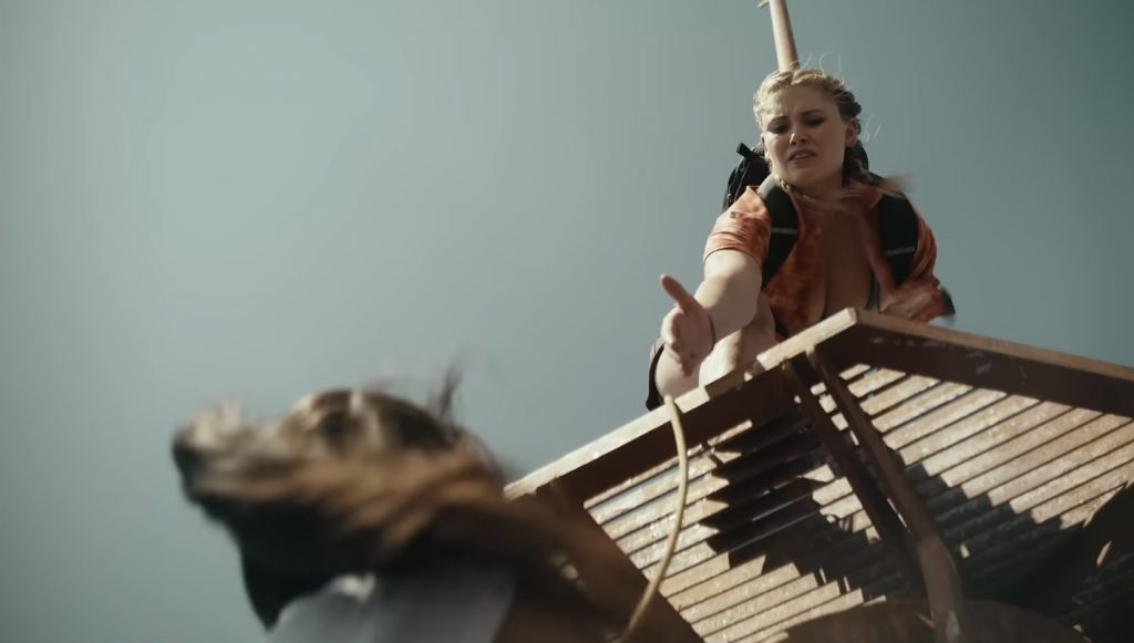 В «Вышке» схожая завязка: две героини застревают на площадке телебашни на высоте 600 метров. Бекки и Хантер приходится ютиться на нескольких квадратных метрах. Заснёшь ночью и неосторожно завалишься на бок - полетишь в пропасть. Вокруг летают грифы, которые только и ждут, когда девушки обессилят и сдадутся на милость хищникам. Это те же акулы, только не в воде, а в воздухе.