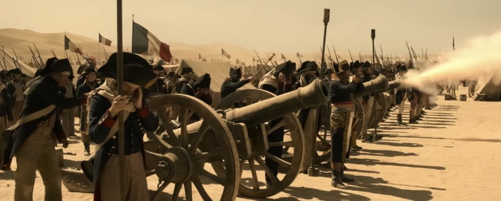 ВПЕЧАТЛЕНИЯ И АКТЕРЫ: фильм Ридли Скотта начинается с блестящей военной победы в Тулоне, где 24-летний корсиканец захватывает городскую артиллерию чтобы использовать ее против испанских и британских кораблей. В одном из эпизодов Наполеон атакует городские стены, когда пушечное ядро попадает в грудь его лошади, заставляя животное и его всадника кувыркаться назад. Прижатый конем, окровавленный молодой офицер поднимается на ноги и продолжает идти вперед. Нечасто режиссер создает образ войны, какого зрители еще не видели, и с самого начала устанавливает высочайшую планку.