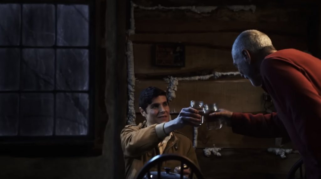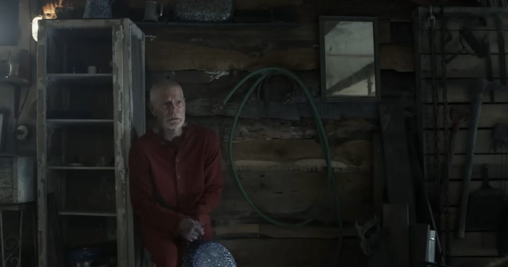 Если вы собираетесь снимать фильм только с двумя персонажами и в одной локации, диалоги должны быть захватывающими. Слова Старика неубедительны, он постоянно удлиняет развитие простых идей ради создания фальшивой таинственности. Плоский сценарий не содержит ни остроумия, ни саспенса. Мужчины бесконечно болтают, никогда не говоря ничего по существу. Этот словесный танец, ничего не дающий разуму, просто сводит с ума. И не спасает положения то, что по воле режиссера Старик щеголяет с ног до головы одетым в ярко-красное длинное нижнее белье. А его визави, Джо, может похвастаться совершенно новой и нетронутой желтой курткой (несмотря на то, что он, якобы, часами бродил по лесу).