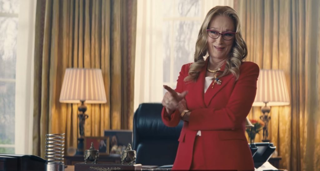 Дженнифер Лоуренс чувствует себя неуютно в образе затюканного аутсайдера Кейт Дибиаски, говорящей правду власти, хотя, в прессе упоминалось, что эта роль была написана специально для нее. В роман между Дибиаски и Квентином мало верится, в то время как Мерил Стрип, при всех ее многочисленных талантах - вовсе не прирожденный комик. Президент Дженни Орлеан явно смоделирована по образцу Трампа. Она из тех, кто не стесняется курить на публике и может назначить знакомого анестезиолога главой НАСА. Режиссер к тому же издевается над сторонниками MAGA (Make America Great Again) в красных кепках с надписью «Look Down».
