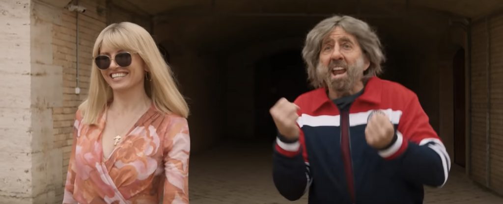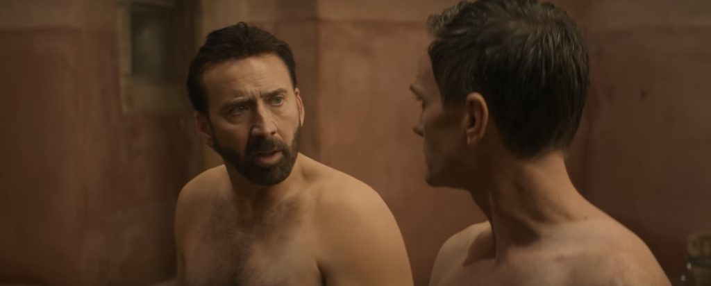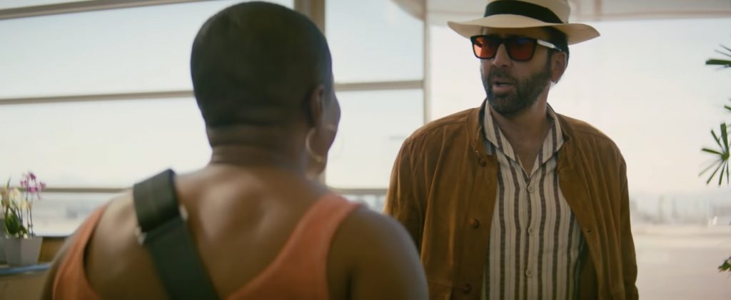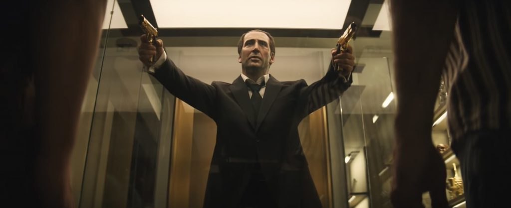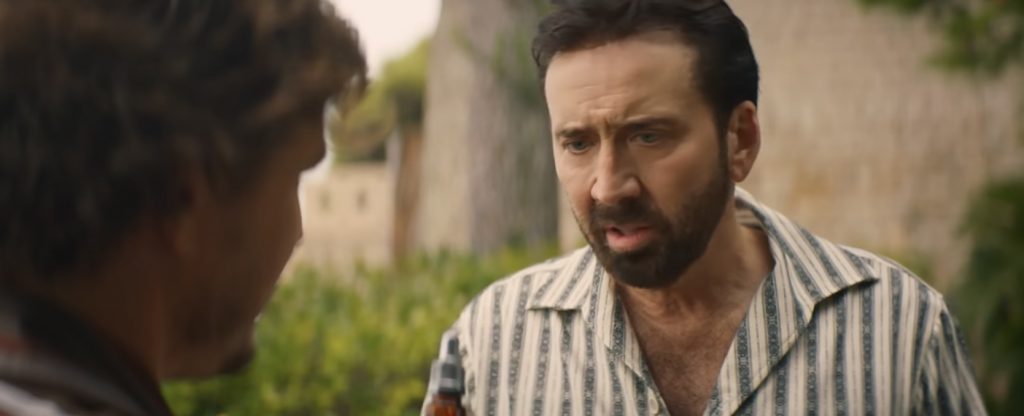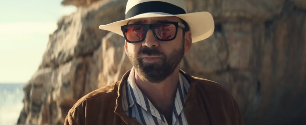 Кто-то воспринимает его в образе парня из мелодрамы «Во власти луны», а другой видит в нем террориста из триллера «Без лица». К тому же, рассказ о том как ее племянник любит «Крудс 2» (в озвучке Кейджа) дает возможность героине Хэддиш отвлечь Ника на достаточно долгое время, чтобы установить на него трекер. Эпизоды, копирующие сцены из его боевиков, вроде «Угнать за 60 секунд» или «Сокровище нации», могут легко показаться уловкой, но нервный срыв у бассейна заставляет вспомнить игру Кейджа в фильме «Покидая Лас-Вегас», отмеченную премией «Оскар». В сюрреалистическом повороте Кейдж, в стиле своей картины «Адаптация», играет двойную роль Ники (где он указан под своим настоящим именем: Николас Ким Коппола) - гротескного призрака прошлого, стилизованного под эксцентричных персонажей фильмов «Дикие сердцем» и «Поцелуй вампира».
