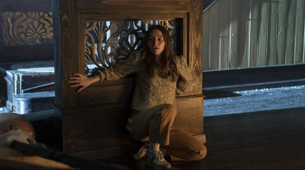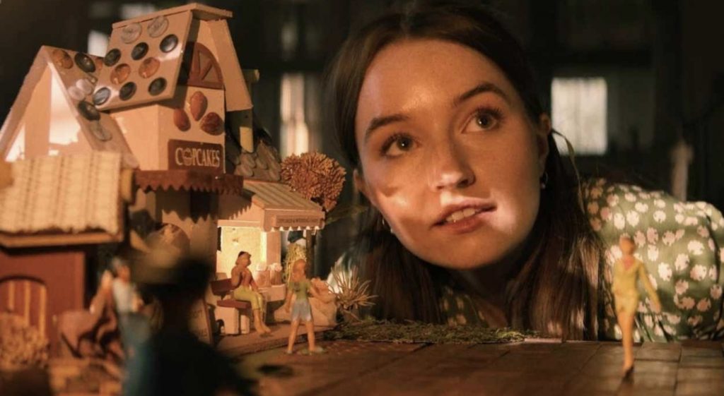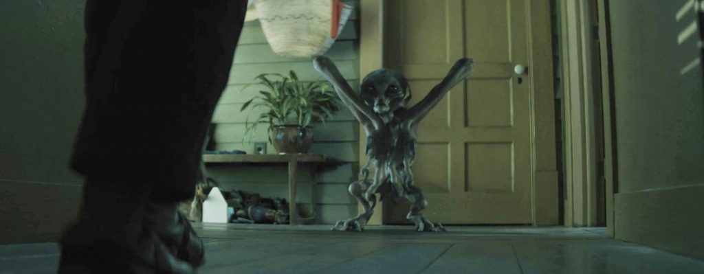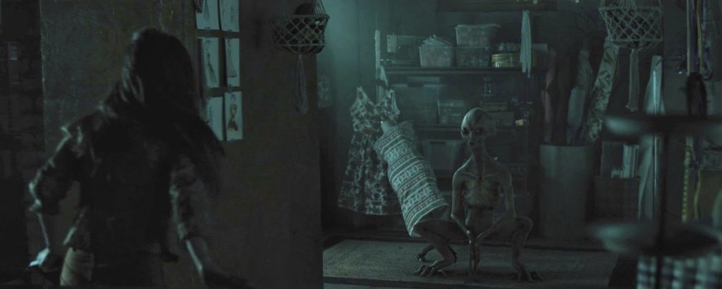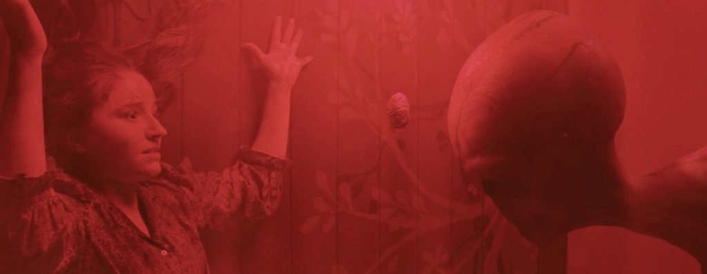 И максимально уместные полтора часа хронометража дают этому концепту столь важное дыхание жизни, не позволяя ему растянуться до неприличных размеров и вместо развития сюжета погрузиться в болото пустых размышлений о проблемах «калифорнийского общества», в котором живут создатели (что произошло с «Нет» Джордана Пила, например). Героиню, восхитительно сыгранную Кейтлин Дивер, ведут к моменту излома с первых же пасторальных видов её огромного пряничного домика, ярких платьев и тщательно собираемых игрушечных моделей идеальной жизни, красиво отсылающих к «Реинкарнации» Ари Астера. Эта идеальность погружена в необъяснимое душное молчание, сжимающее глотку куда сильнее местных инопланетных хедкрабов, потому визжаще-скрипящие окрики пришельцев становятся едва ли не спасением. Главная героиня Бринн за весь фильм произносит всего одну осмысленную фразу, становящуюся тем не менее фундаментально важной для развязки, 5 слов за целый фильм в череде криков, грохочущих чужеродных стонов, треска ломающегося мира внутри и снаружи. Изоляция, как это теперь будет часто бывать после известных событий начала нынешнего десятилетия, опять становится одним из главных антагонистов. Только в тихом месте Бринн не просто нельзя говорить вслух даже с собой, а не с кем даже и переглянуться, а заглавие фильма словно обрекает её задолго до встречи с пришельцами. И именно поэтому они кажутся жуткими только в первом акте, цыкая на цыпочках по гладкому паркету её дома, а дальше словно проникаются её безнадежной борьбой за существование (такое ли нужное ей самой?) и начинают выглядеть человечными существами, пусть их гуманизм и отдаёт ощущением последующих бесконечных адских мук.