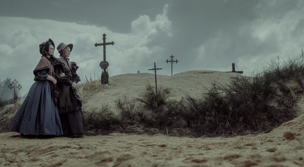В новом «Носферату» вынужденных мер нет. Напротив, буквально каждое визуальное и звуковое решение - осознанное. Плод напряженных раздумий и изощренных усилий. На глазах у нас оживает живопись Каспара Давида Фридриха - Томас на обрыве на фоне тревожного пейзажа, Элен у окна. За ним следуют кошмары с гравюр Гойи (крысы тут живые, никаких спецэффектов - по заветам Херцога). Душные эротические сновидения - с полотен Иоганна Генриха Фюссли. Сумеречные интерьеры - Вильгельма Хаммерсхея. Красота - кровь из глаз; еще одна из визуализированных в «Носферату» метафор. Перфекционизм режиссера разделяет оператор Джарин Блашке (соратник Эггерса со времен «Ведьмы»), чья работа с естественным и искусственным светом не может не восхищать. А композитор Робин Кэролан знает назубок классику романтической и постромантической музыки.