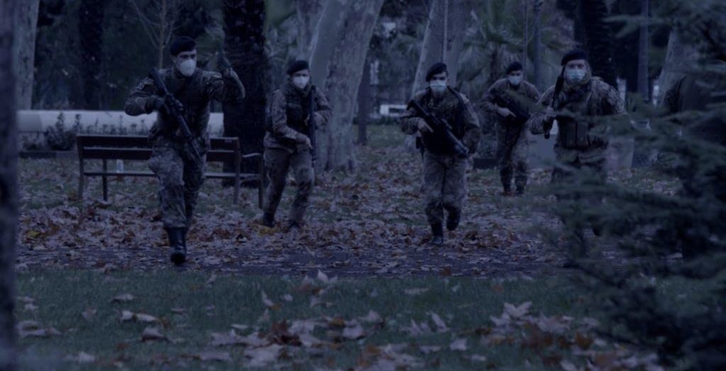 Атмосферу истории усиливает, как ни странно, ковид и все его сопутствующие атрибуты. Полиция носит медицинские маски, которые в данном случае выступают не в качестве защиты от возможной инфекции, а как новомодный способ сохранения анонимности у органов якобы правопорядка, способствующих уличному беспределу. Бесконтактные термометры, и в реальной жизни напоминающие пистолеты, подносятся ко лбу с интонацией, больше подходящей для игры в русскую рулетку.