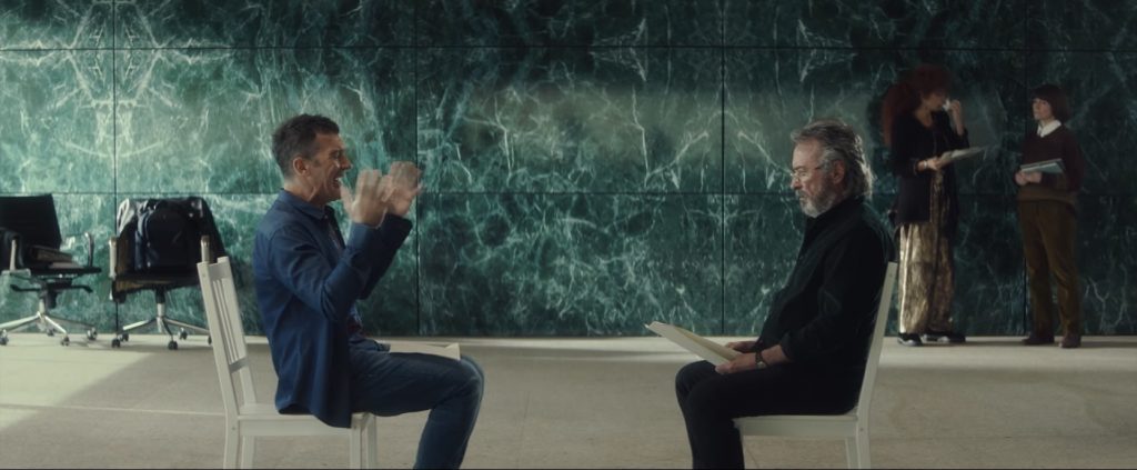 ВПЕЧАТЛЕНИЯ И АКТЕРЫ: сразу стоит оговориться, что «Официальный конкурс» в (извините) официальном конкурсе Венецианского кинофестиваля нашел свое идеальное место, пусть фильм в целом и далек от картин, которые принято называть фестивальными. Зато он с ними беззастенчиво заигрывает и вдоволь иронизирует над творцами - а Лола и ее артисты именно такие. С экрана сыплются бесконечные подмигивания премиям и кинофестивалям, насмешки над большими именами и тяжелыми статуэтками - в кадре буквально появляются трофеи, принадлежащие артистам. И это неприличное количество бессовестных, но все же очень забавных отсылок, возможно, именно публикой в Венеции будет восприниматься благосклоннее всего. Невольно даже возникает ощущение, что картина и была придумана режиссерами и сценаристами Мариано Коном и Гастоном Дюпра специально для участия в смотре. Предыдущий раз они были в Венеции 6 лет назад с еще одной комедией, «Почетный гражданин», тогда Оскар Мартинес (который здесь сыграл Ивана) забрал кубок Вольпи за мужскую роль. Несомненно, внутренняя кухня этим авторам хорошо знакома, но все же «Официальному конкурсу» не удается окончательно скатиться в капустник с любимыми и заслуженными или местечковый междусобойчик для фестивальной тусовки. Несмотря на то что все персонажи скорее трафаретные типажи с гипертрофированными характерами, все же у них есть если не второе дно, то какое-то человеческое очарование.