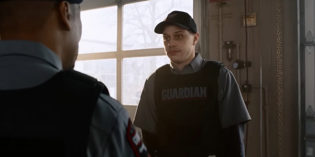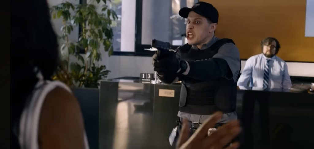 Все достаётся его партнёру Питу Дэвидсону, который играет Трэвиса - туповатого охранника из тех, кто паникует под давлением. В начале фильма Трэвис направляет пистолет на клиентку банка, думая, что та пытается его ограбить. Но Зои (Кеке Палмер), расслабленная и обаятельная, просто хочет дать ему свой номер телефона. А затем оказывается, что именно она - главный мозг ограбления. И вторая фаза ее плана - почти прямое копирование «Одиннадцати друзей Оушена»...