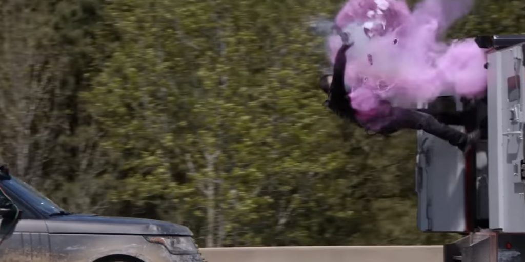 Удивительно, но сюжет почти компенсирует отсутствие юмора экшеном. Уже в самом начале троица бандитов на двух мощных внедорожниках блокирует бронированный грузовик, но двое охранников решают прорываться, потому что Рассел убеждён, - грабители убьют их, если они остановятся. Сцена поставлена по- богатому: настоящие автомобили мчатся по длинному участку дороги, каскадёры забираются на внедорожники, цепляясь за кузов грузовика, и все машины опасно маневрируют друг вокруг друга. Погоня плавно переходит от фазы к фазе, не спешит и создаёт напряжение благодаря ещё и тому, что большую часть трюков выполняют сами актёры.  На самом деле, и другие экшн-сцены в фильме невероятны. Красотка Ева Лонгория появляется в самый разгар событий, словно яростная Тараджи П. Хенсон в конце фильма «Раздражительность». Наблюдая за тем, как Эдди Мерфи выполняет удары ногами, бросает пакеты с краской и иными способами отбивается от грабителей, можно вспомнить о том, как в свои 64 года он всё меньше хотел исполнять трюки самостоятельно. И даже говорил об этом режиссёру комедии «Полицейский из Беверли-Хиллз: Аксель Фоули» Марку Моллою.  В фильме «Ограбление» пули свистят повсюду, а единственная, которая действительно попадает в цель, убивает владельца автомастерской, которого сыграл Маршон Линч, легенда американского футбола по прозвищу «Зверь»….