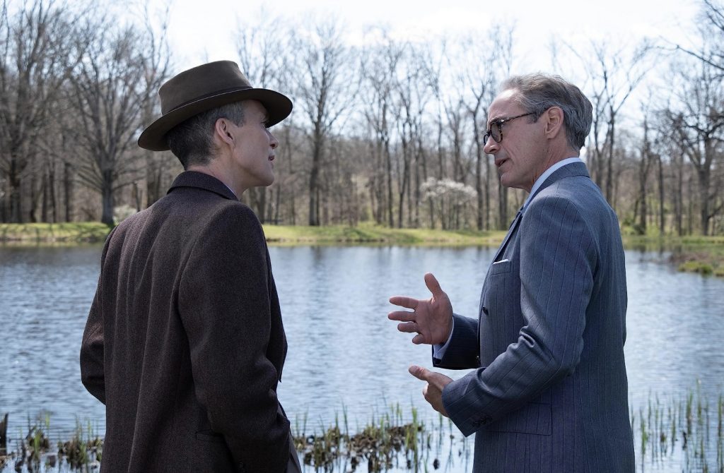 Великолепно сыгранный неузнаваемым Робертом Дауни мл. (каким же яростным, судя по всему, было его желание освободиться от Тони Старка!) Штраусс рассказывает свою версию истории на слушаниях, суть которых прояснится не сразу. Оппенгеймер, очевидно ставший для Киллиана Мерфи ролью всей жизни ( такая выпадает лишь единожды), тоже проходит допрос с пристрастием, по итогам которого решится, сохранит ли он свое незаурядное влияние или останется без доступа к важнейшему стратегическому процессу - работе над водородной бомбой. Нолан признавался, что его двое героев вдохновлены Сальери и Моцартом из «Амадея» Милоша Формана. Опять музыка.