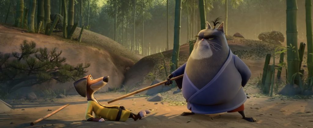 При этом надписи, которые появляются в кадре, - чаще бессмысленные каракули, лишь внешне напоминающие иероглифы, или английские слова, написанные шрифтом вонтон. В яркой анимационной облочке авторы шутят над клишированностью азиатских сюжетов и даже вставляют забавную отсылку к «Убить Билла». Хэнк в желтом кимоно с черными полосками проходит обучение у великого самурая Джимбо, как Беатрикс Киддо - у китайского сенсея Пэй-Мэя. Оба ментора легко встают на тоненькое бамбуковое копье, но в анимационной пародии ученик может попросить перемотать нарезку кадров тренировок к моменту, когда у него все уже начнет получаться.
