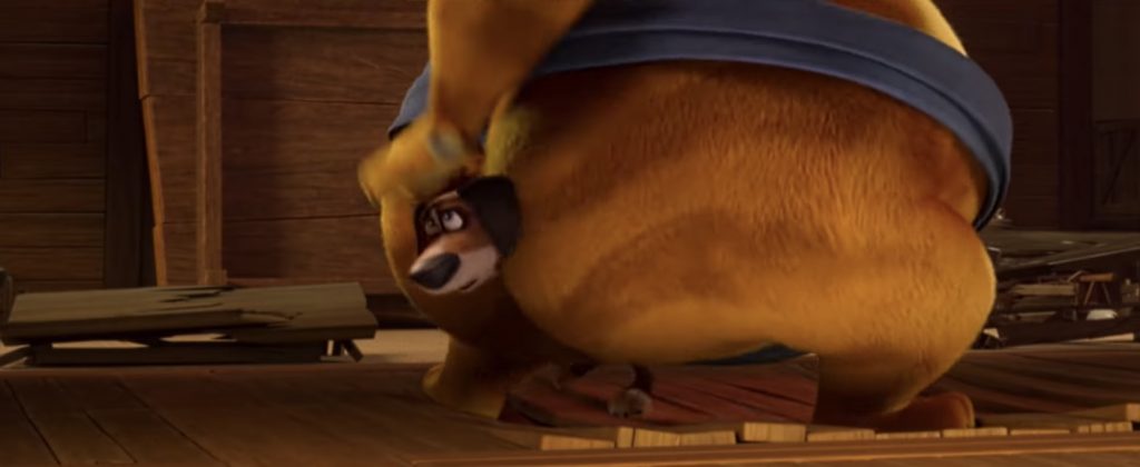 С другой стороны, помимо серьезных тем, в мультфильме предостаточно взрослых шуток и отсылок. Из уст симпатично отрисованных героев звучат смешные ругательства вроде «йошкин пес», «чушь кошачья» и «их тут до кота и больше». Джимбо, переживающий кризис среднего возраста, нередко прикладывается к бутылке с валерьяночкой. И с самого начала фильма ломается четвертая стена: герои обращаются напрямую к зрителям, делятся своими флешбэками, выбегают в кинозал или озвучивают хронометраж мультика. Наконец, персонажи сами называют эту «катавасию» фильмом. Его мир предельно условен и сам об этом буквально кричит. А судя по громкому детскому смеху в эти моменты, такие эксперименты действительно работают.