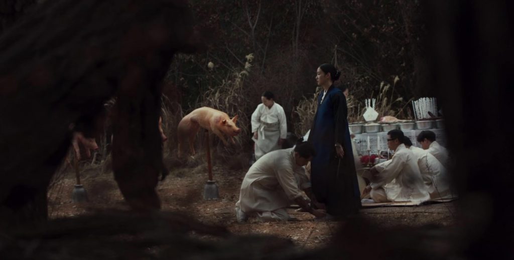 Для корейского зрителя страшен не вид антагониста, а его происхождение: и хотя японская оккупация оказывается причиной всех бед, картина не заставляет смотрящего сверяться с историческими справками. Жезлы, которые намереваются раскопать, по диалогам героев кажутся всего лишь легендой, внезапно ставшей былью, - такое часто случается в хоррорах. Однако политическая реальность такова, что японское правительство когда-то нашпиговало корейскую землю железками, чтобы приостановить энергетические потоки: жители в оккупации сильно верили в фэн-шуй, и даосская практика ориентира на энергию была одним из немногих культурных оплотов, за которые еще можно было держаться.