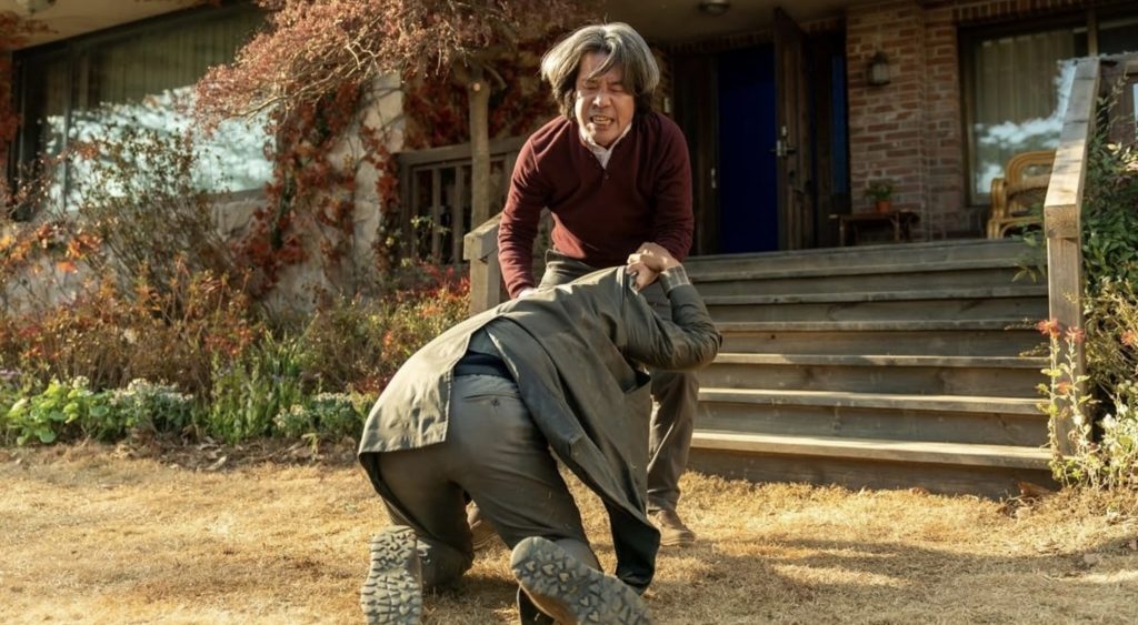 ВПЕЧАТЛЕНИЯ И АКТЕРЫ: первый час «Ровно в 4 после полудня» - мастерски выстроенное кино, которое минута за минутой, кадр за кадром нагнетает напряжение. Картина основана на романе «Катилинария» бельгийской писательницы Амели Нотомб. Супруги прибывают в сельскую местность, где царит безмятежность: режиссер Сон Джон-у не жалеет времени на окружающий ландшафт - теплая осень побуждает замедлиться, полюбоваться красно-желтыми листьями и устроить завтрак на террасе. Идиллия героев ежедневно рушится в 16:00 - сосед, как по расписанию, колотит в дверь и на два часа завладевает вниманием пары. Постановщик в сдержанной манере повышает уровень беспокойства: Чжон-ин, будучи интеллигентным мужчиной, пытается вести светскую беседу, но неловкость и нервозность повисают в воздухе. И так день изо дня: Чжон-ин и Хён-сук отныне обречены жить в ожидании и с беспокойством поглядывать на стрелки часов.