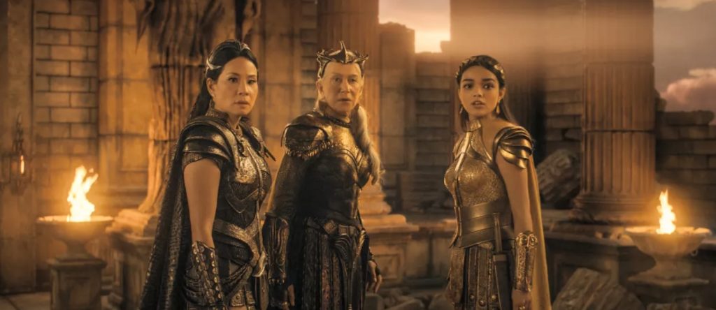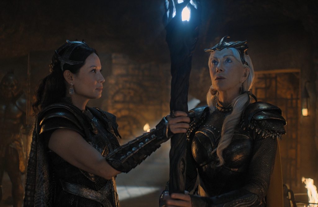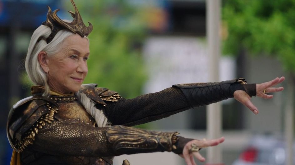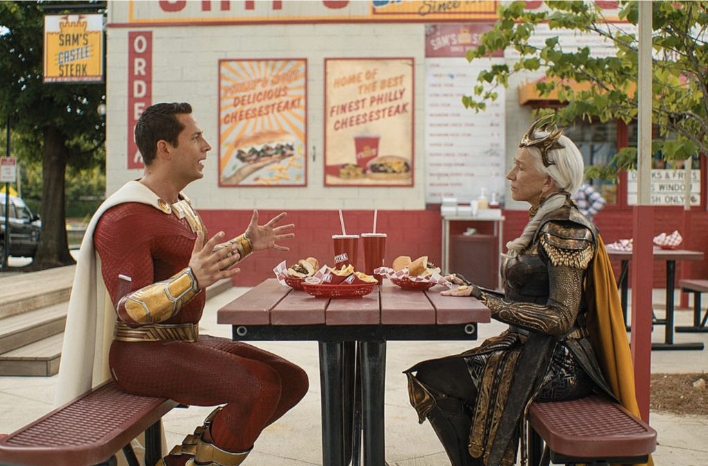 Естественно, сражаются они против суперзлодеев, о чем свидетельствует хотя бы кастинг. Хелен Миррен, Люси Лью и Рэйчел Зеглер играют Гесперу, Калипсо и Антею, дочерей Атласа, которые пришли на Землю, чтобы забрать силу богов у Шазама и его команды. Поговаривают, что блестящая актриса Хелен Миррен («Голда. Судный день», «Барби», «Форсаж») «могла бы сыграть и телефонный справочник». Но сценарий Генри Гайдена («Шазам!») и Криса Моргана (шесть из девяти фильмов «Форсаж») не дает ей возможности оторваться подобно Кейт Бланшетт в «Тор: Рагнарёк» или Марку Стронгу в «Шазам!». Поэтому забавный эпизод, когда Геспера, поедая чизбургер, объясняет почему они считают детей-супергероев «плохими парнями», выглядит обычным бурчанием взрослых в адрес подростков.