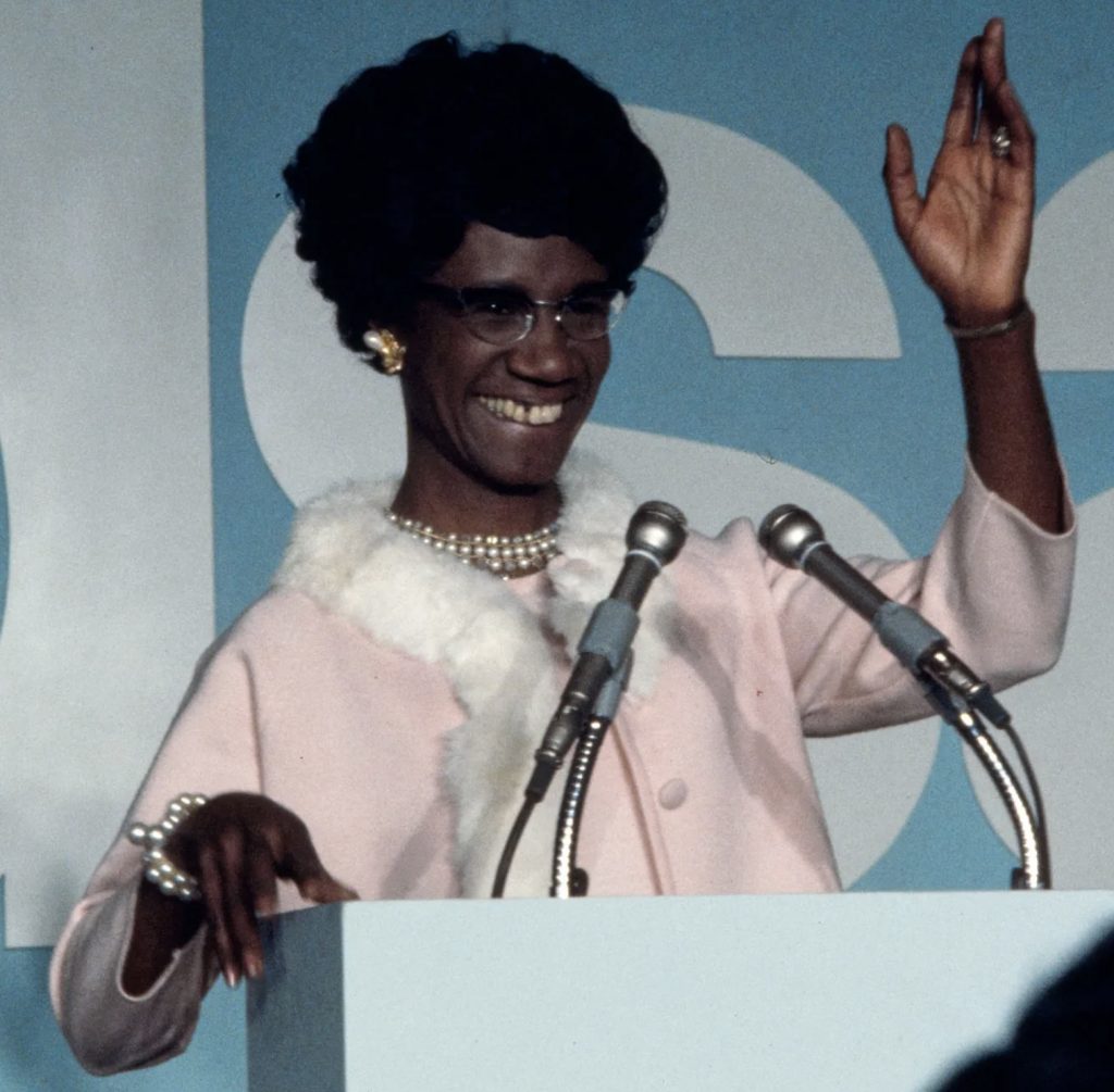 В 1968 году она стала первой темнокожей женщиной, избранной в Конгресс США. Чисхолм работала в Конгрессе на протяжении семи сроков с 1969 по 1983 год. В 1972 году она выдвигала свою кандидатуру на пост президента Соединённых Штатов от Демократической партии, став первой женщиной и представителем афроамериканского сообщества, выдвигавшейся на эту роль.