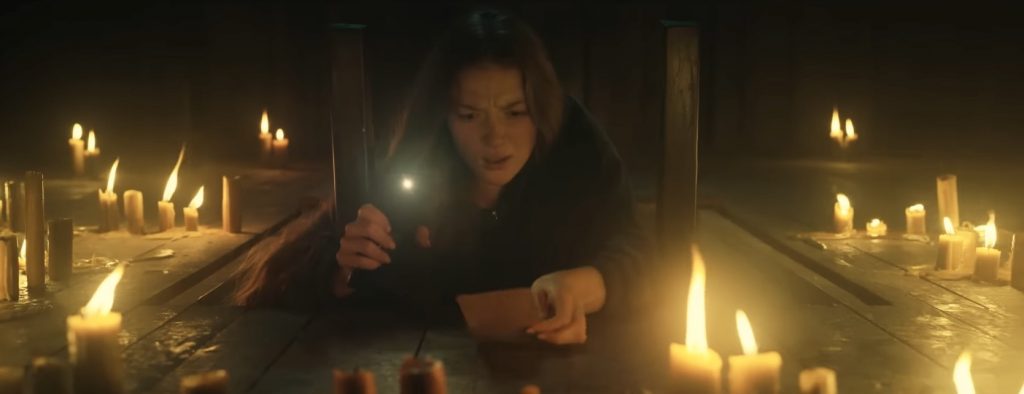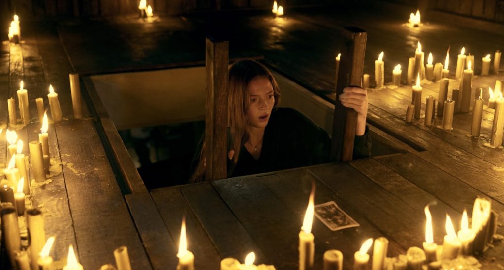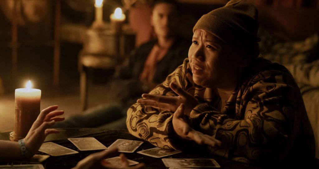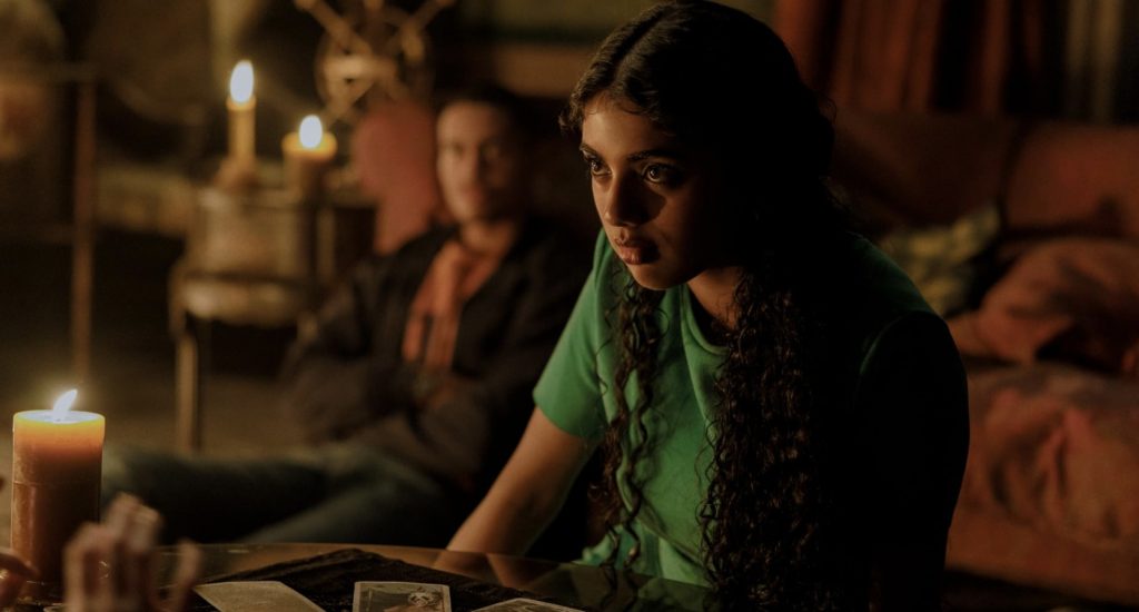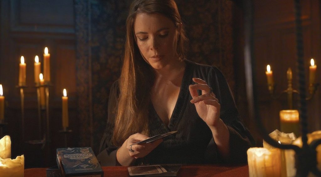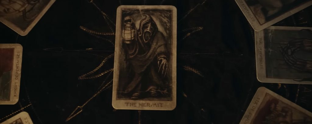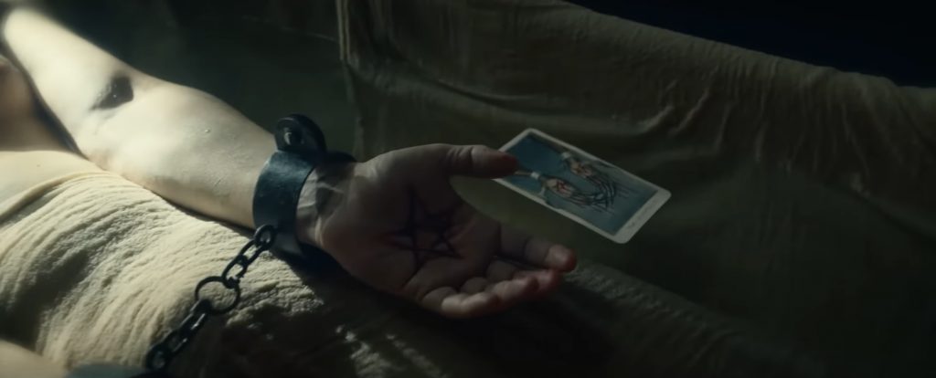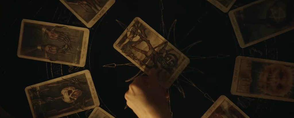 Режиссеры-дебютанты Спенсер Коэн и Анна Халберг начинают свой фильм с места в карьер. Именинница Элиза (Ларсен Томпсон) возвращается одна в опустевший съемный дом, сталкивается с Верховной Жрицей, своим персонажем Таро и существо не собирается оставлять молодую женщину в живых. Этот первый кадр ясно задает чувство стиля: оператор Эли Смолкин использует резкое освещение и ползущие тени, чтобы усилить тот небольшой фактор страха, который заложен в сценарии. Звуковое оформление в «Таро» превосходно и подчеркивает яркий, изобретательный визуал.