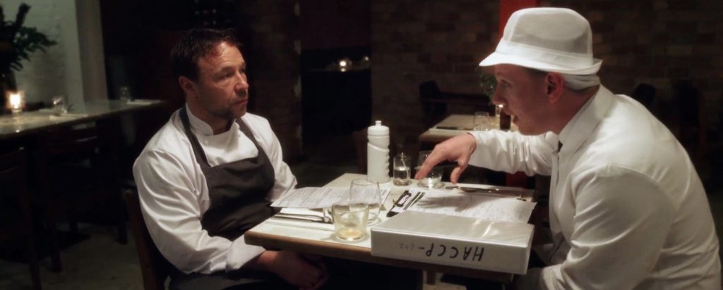 О ЧЕМ КИНО: вечер пятницы накануне Рождества, шеф-повар хорошего, хоть и не самого модного лондонского ресторана Энди Джонс (Стивен Грэм) идет на работу. Он уже нетрезв, уже опаздывает, уже забыл заказать продукты для ресторана, уже расстроил своего маленького сына. В ресторане его ждет санинспектор, который с неподражаемой вежливостью снижает заведению оценку с пяти до трех, потому что документы не в порядке, а на кухне хаос. Кто-то работает без перчаток, кто-то моет руки не там, где положено, каких-то продуктов не хватает, температура в холодильнике на верхней границе нормы; кто-то опаздывает, у кого-то суицидальные наклонности, кто-то торопится на ночную работу диджеем, сушеф из последних сил пытается руководить процессом. Энди то впадает в ярость, то смотрит на свое заведение как смертельно уставший сантехник на цунами. Потом появляются посетители, и проблем становится столько, что разгрести их уже невозможно…