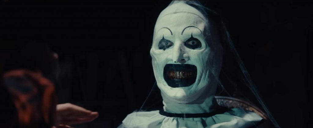Впервые ключевой персонаж будущей франшизы, более всего похожий, пожалуй, на Марселя Марсо, вздумавшего сняться у Жана Роллена, появился в качестве одного из подручных дьявола в короткометражном «Девятом круге», который начинающий постановщик спецэффектов Дэмиен Леоне сотворил в 2008 году за три тысячи собственных долларов. В 2011-м инфернальный мим устроил резню на проселочном хайвее, выйдя на первый план в «нулевом», тогда еще двадцатиминутном варианте «Ужасающего». В 2013-м обе новеллы (плюс еще одна, где Арт появлялся только на жутком портрете) оказались записаны на видеокассету, которую малолетние брат с сестрой и их няня обнаружили в мешке для хэллоуиновских сладостей в полнометражном дебюте Леоне, антологии «Канун Дня Всех Святых». А еще через два года на продвинутом (именно там в свое время впервые заявили о себе Майкл Мур и Роберт Родригес) фестивале «Теллурайд» состоялась премьера полнометражной версии «Ужасающего», явно снятой, по заветам великого однофамильца режиссера, «за пригоршню долларов» (по разным сведениям, от $35 тыс. до $55 тыс.), собранных Леоне в интернете. Фильм не без успеха прокатился еще по нескольким специализированным смотрам от Лондона до Кентукки, а перед тем, как появиться на носителях, мелькнул в очень ограниченном прокате (несколько дней в считаных кинотеатрах).