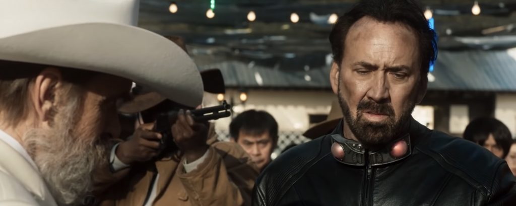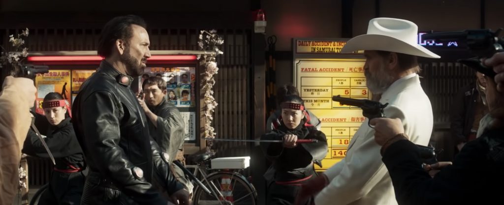 О ЧЕМ КИНО: безымянный Герой (Николас Кейдж) неудачно ограбил банк. Его напарник с по кличке Псих (Ник Кассаветис) в самый ответственный момент сошел с ума, убил всех, кто в банке находился, и исчез. Героя поймали, раздели до набедренной повязки, связали и посадили в клетку. По-видимому, навсегда. Тем временем, белая ворона среди японок, внучка некого Губернатора (София Бутелла) захотела сбежать от грозного и неприятного деда, но, выбравшись из родного города, попала в плен в стране призраков. Губернатор вместе с другой (и очень дурной) внучкой под хвалебные песни десятка японок приезжает к Герою, облачает в костюм со взрывными устройствами (два из них прикрепляются аккурат к паху Кейджа) и обещает свободу, если герой вызволит внучку-Бутеллу. Кейдж зачем-то борется с окружающими его воинами, а затем едет выполнять задание - на велосипеде…